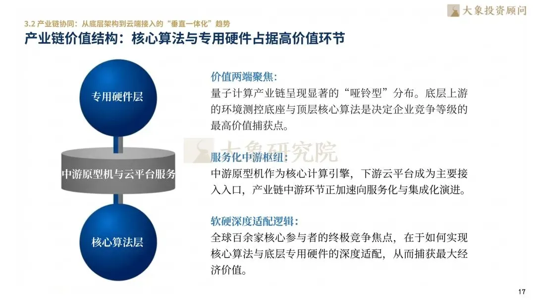 量子计算产业链价值分布呈现显著的“两头高、中间平”特征。上游核心硬件(如极低温设备、射频芯片)与下游算法应用软件占据最高的技术壁垒与价值空间。其中,测控系统作为硬件“指挥部”,预计到2035年其全球市场规模将达996.20亿美元。中游系统集成环节附加值相对较低,但正加速向服务化演进。全栈开发能力已成为头部企业的核心护城河,随着量子纠错技术的突破,产业链价值将向拥有核心算法与高精度硬件能力的头部厂商高度集中。