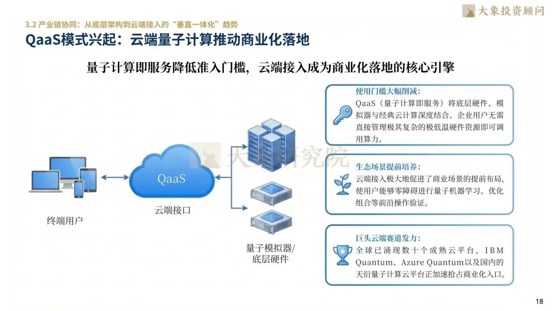 Quantum as a Service(QaaS,量子计算即服务)通过云端平台提供算力,使企业无需维护复杂的极低温(-273.14℃)物理硬件即可使用量子能力,大幅降低了应用门槛。该模式已成为当前商业化落地的主要路径,IBM Quantum、Azure Quantum及国内的天衍平台等均已在云端赛道发力。此外,软件工具链的标准化(如Qiskit框架)正成为锁定开发者生态的关键。QaaS不仅解决了硬件昂贵且稀缺的痛点,更通过培养用户粘性构建了排他性的“生态孤岛”,支撑起早期的商业闭环。