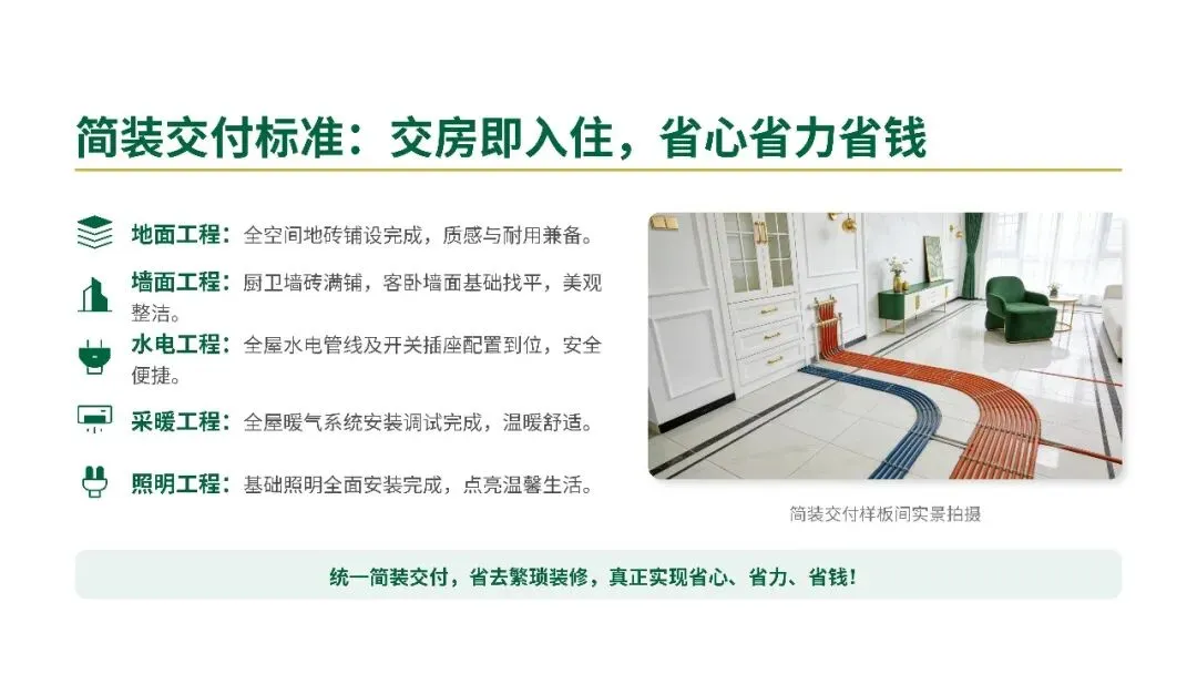 项目实行统一简装交付,基础硬装全部完工,交房仅需搭配软装即可入住,彻底解决业主装修耗时耗力的痛点,真正实现省心、省力、省钱,交付标准明细如下: