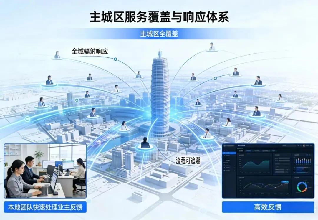 我们的服务力量深度覆盖主城区。通过多站点网格化布局,我们确保工程师就驻扎在您身边。无论您身处繁华商圈还是静谧住宅区,只需一键下单,最近的服务人员即刻响应,让等待成为过去式。