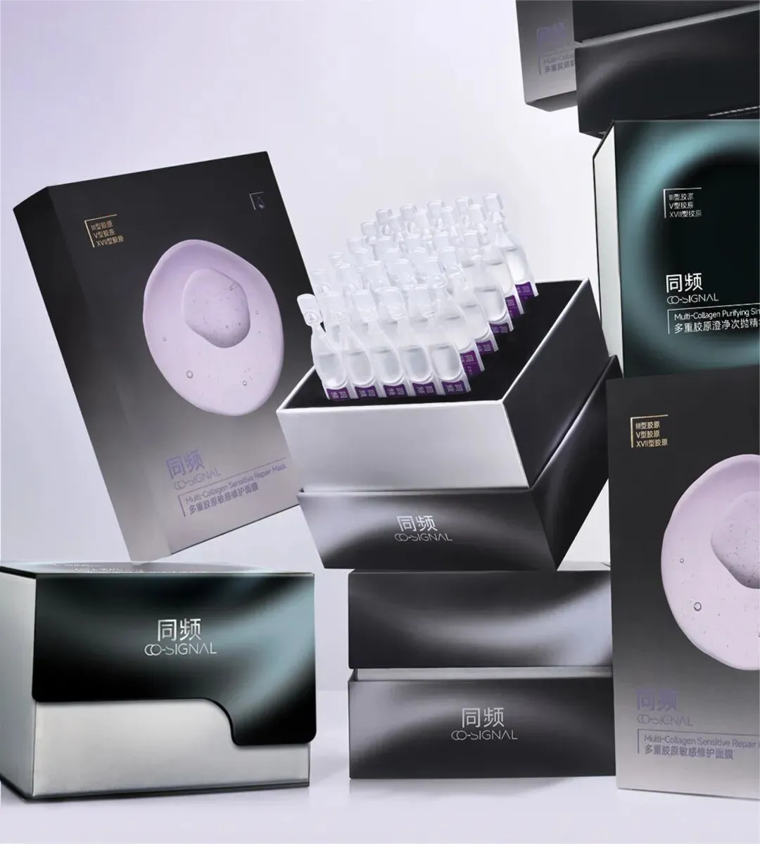 基于这一矩阵,同频针对不同肌肤问题的人群推出针对性的产品,例如主打敏感修护的多重胶原敏感修护次抛精华与面膜,针对油痘敏肌的多重胶原澄净次抛精华。