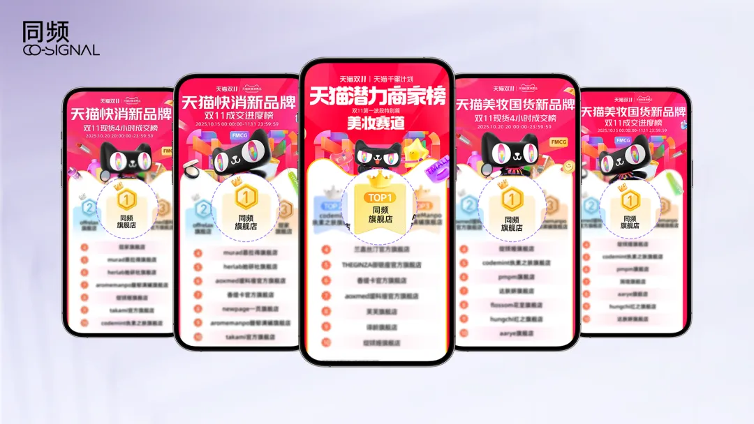2025年双11,同频拿下五个TOP1:天猫美妆国货新品牌现货4小时成交榜、天猫快消新品牌现货4小时成交榜、天猫潜力商家美妆赛道、天猫美妆国货新品牌双11成交进度榜、天猫快消新品牌双11成交进度榜。