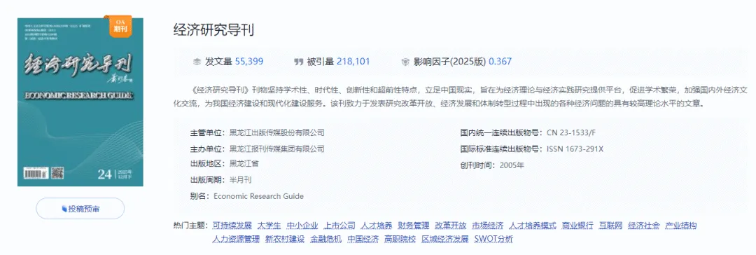 答:《经济研究导刊》是知网、万方、维普收录的期刊。
