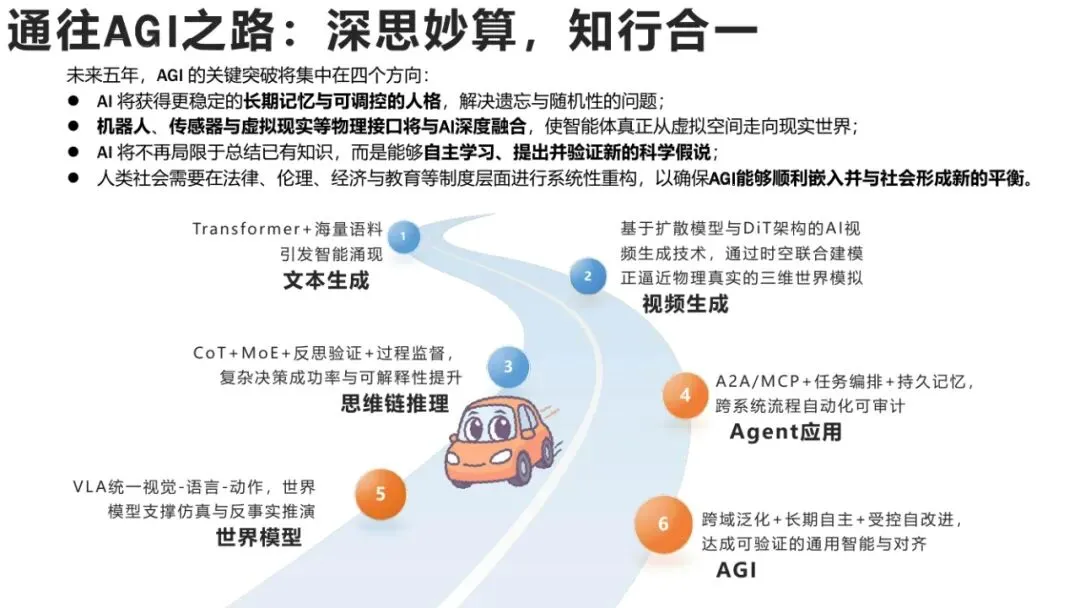 长期(5-10年):类人通识+抽象思维,多模态+长时记忆+行动整合,虚拟与具身智能体融合。形成超人类+非人类特征混合的智能形态,能在社会系统与物理世界中自适应、重构认知。