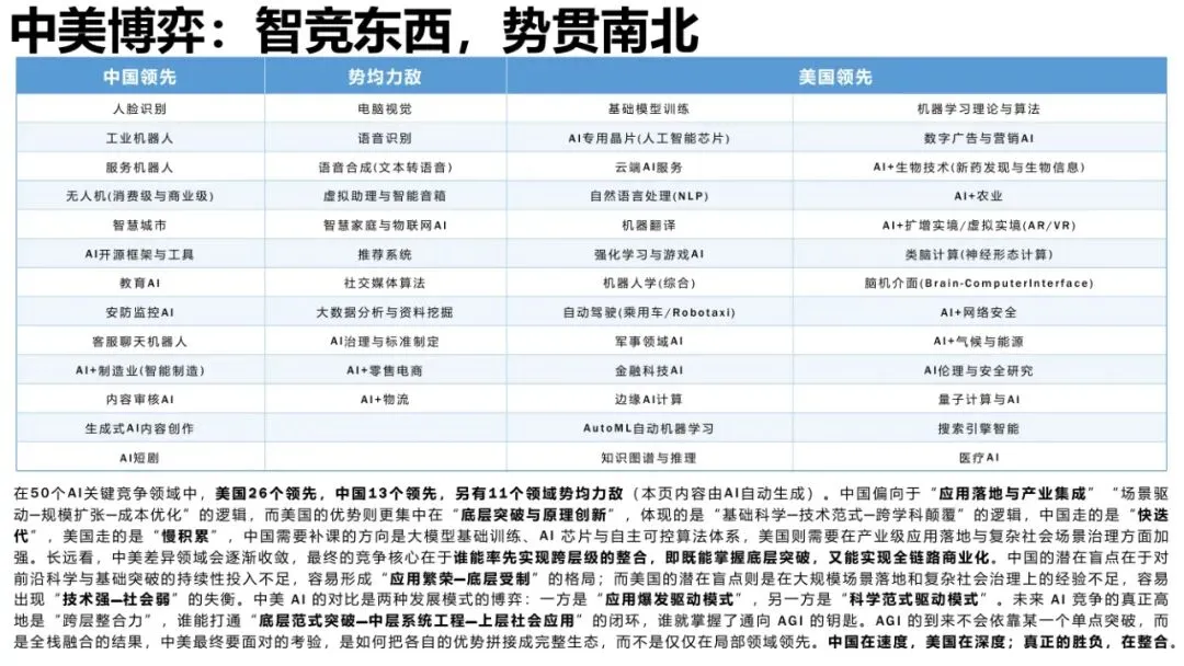 报告深刻指出,中国需要补课的方向是大模型基础训练、AI芯片与自主可控算法体系,而美国则需要在产业级应用落地与复杂社会场景治理方面加强。未来的竞争核心不在于单点突破,而在于谁能率先实现跨层级的整合——既能掌握底层突破,又能实现全链路商业化。