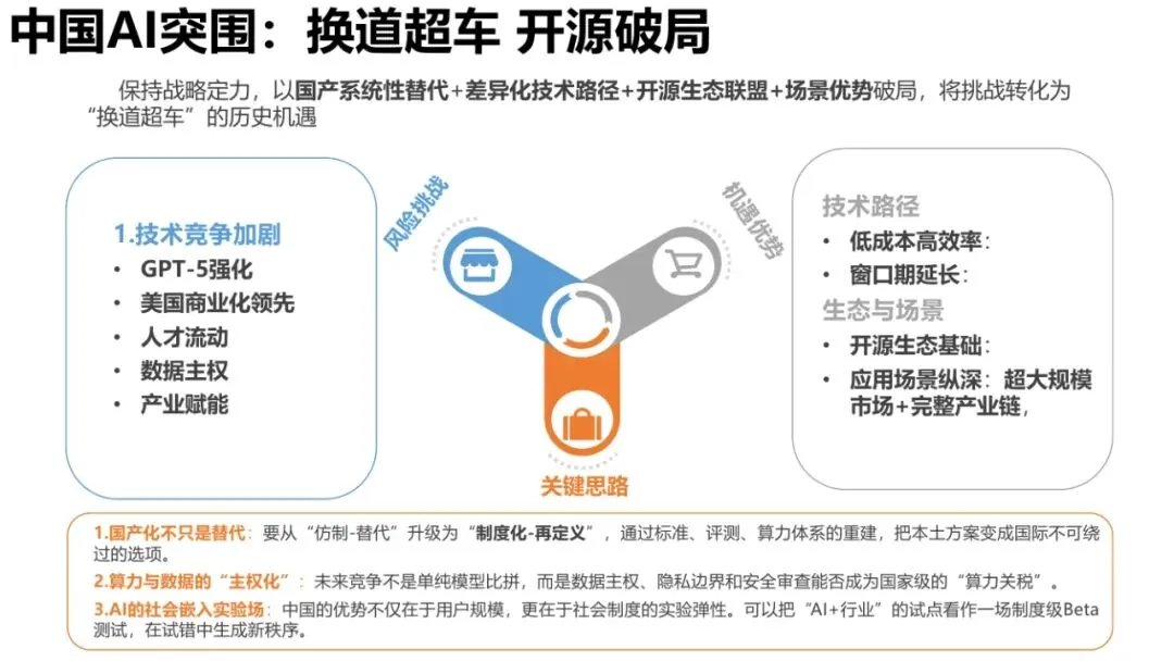 主权AI正从“防御性自主”走向“积极性重构”,将深刻影响全球科技竞争格局与文明叙事力结构。未来比拼的关键是“算力×算法×文化”三位一体的自主生态构建能力。
