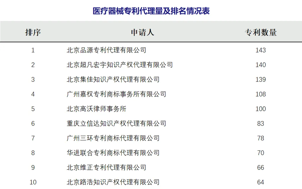 本期专利代理机构医疗器械专利代理量前十: