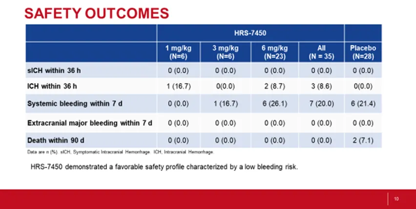 HRS-7450各个剂量组和安慰剂组在给药后36小时内均未发生症状性颅内出血。