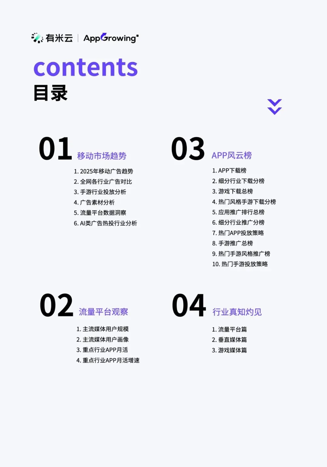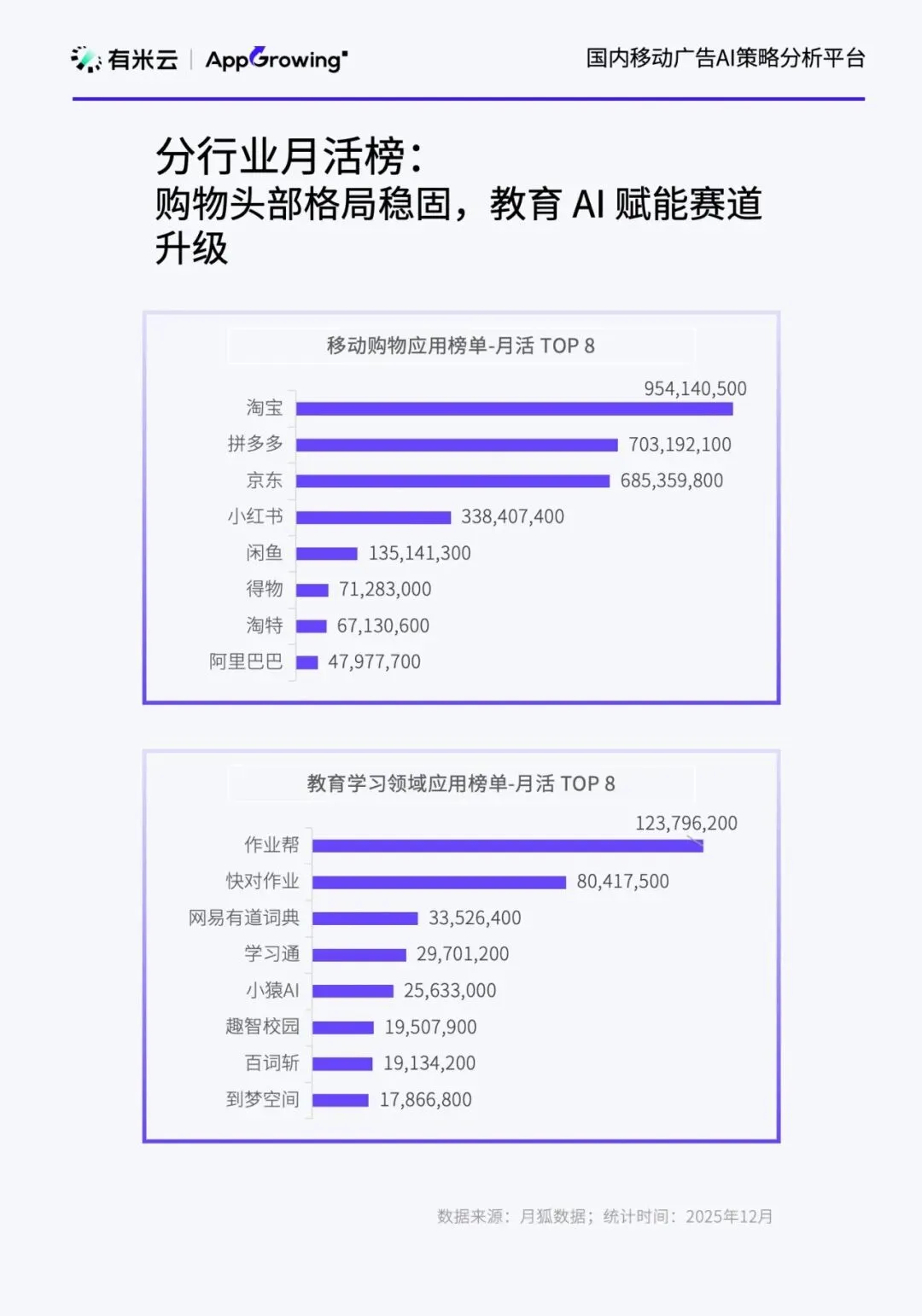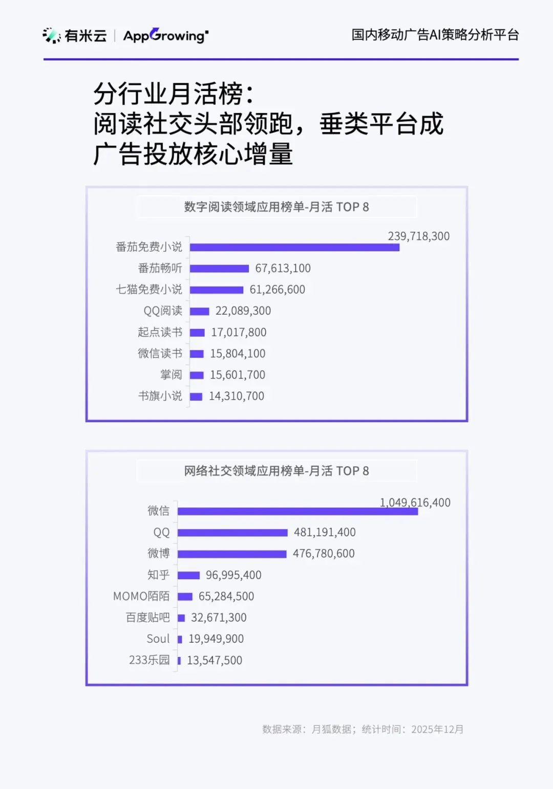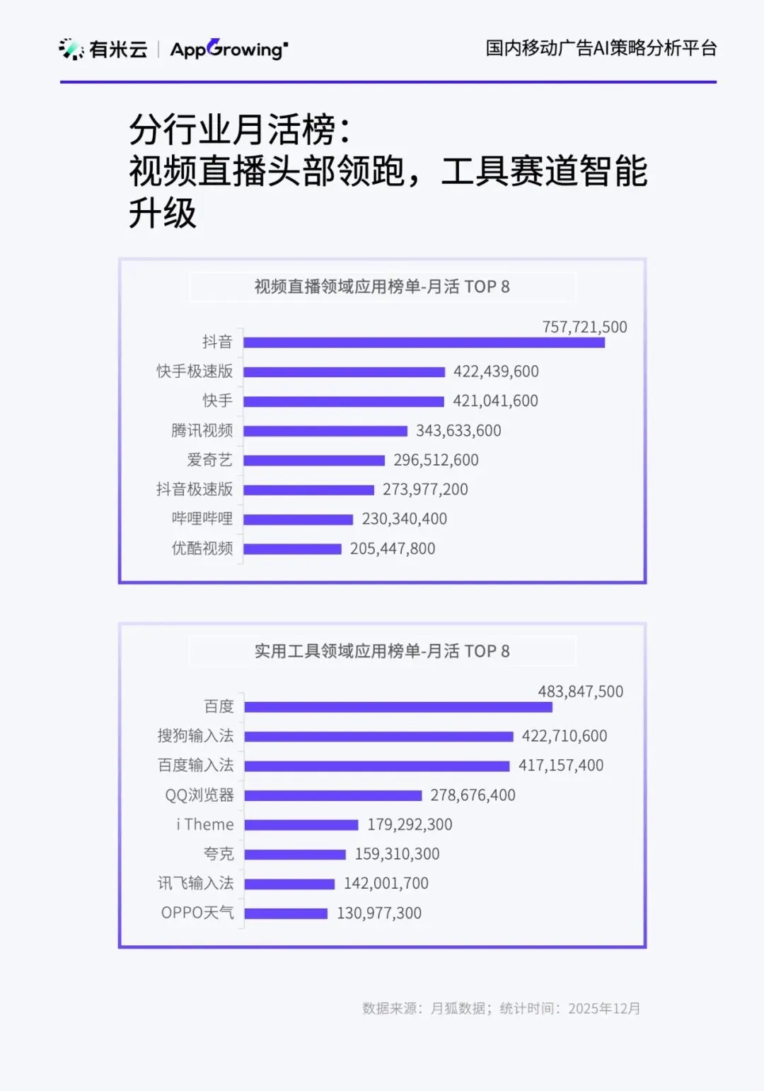 行业投放榜:游戏行业重回年度投放量前二,社交领域明显下滑。 热门应用推广榜:爱聊稳居榜首,红果免费短剧升至第2名;腾讯元宝、夸克浏览器新晋TOP10。 手游推广榜:《向僵尸开炮》连续两年蝉联榜首,仙侠、传奇等细分赛道竞争加剧。