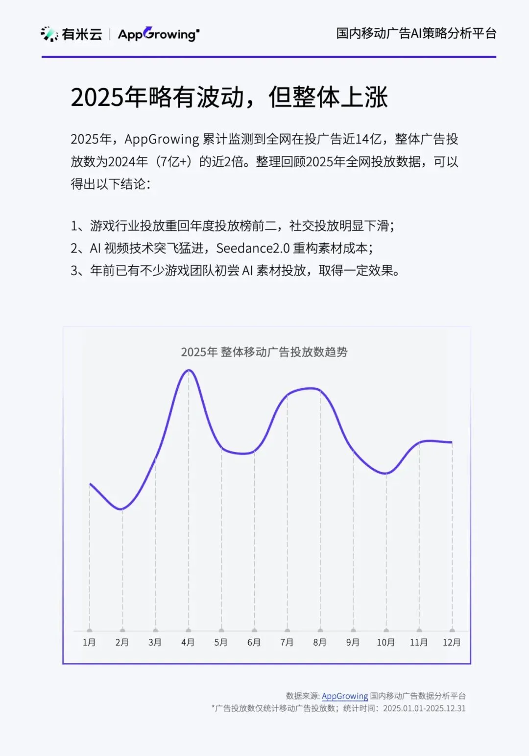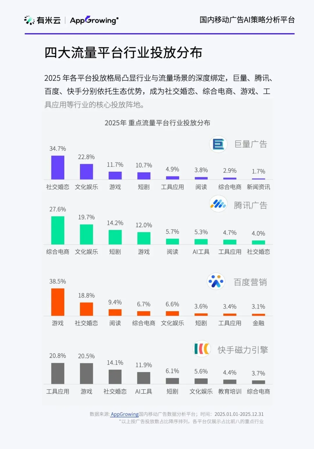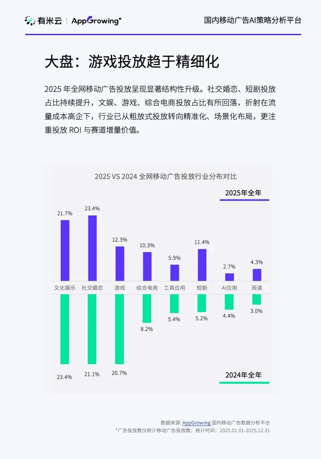 2025年全网移动广告投放量达近14亿,较2024年(7亿+)实现翻倍增长。 行业呈现显著结构性分化:社交婚恋、短剧类广告占比持续提升,而文娱、游戏、综合电商占比回落,反映行业从粗放买量转向精细化运营。 素材形态革新