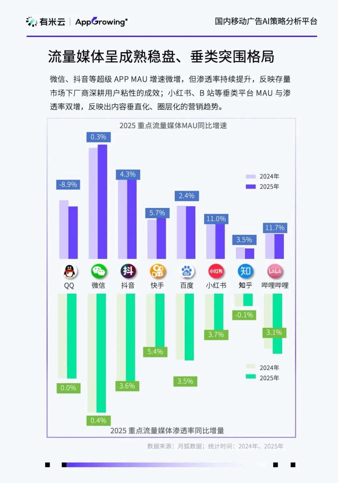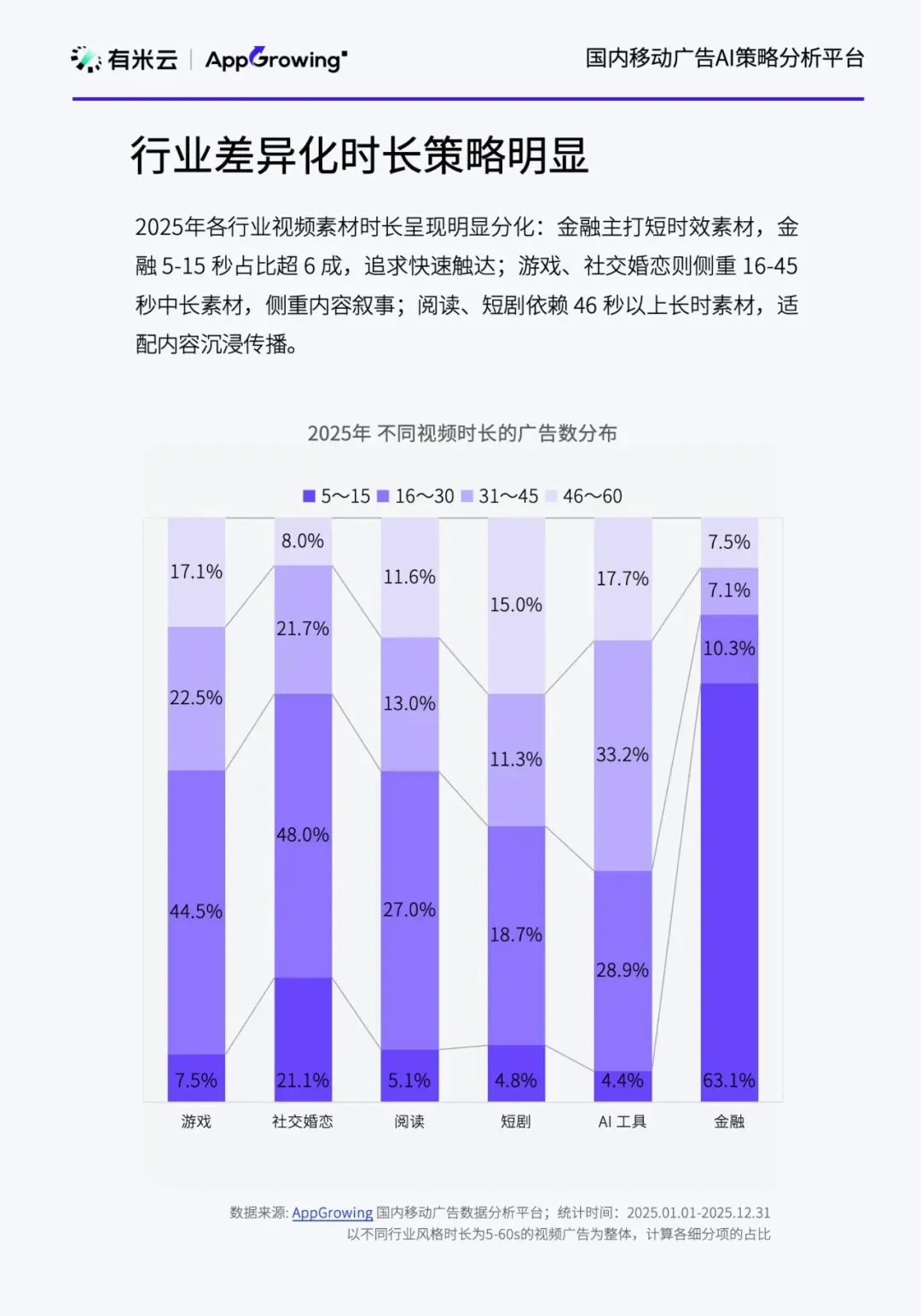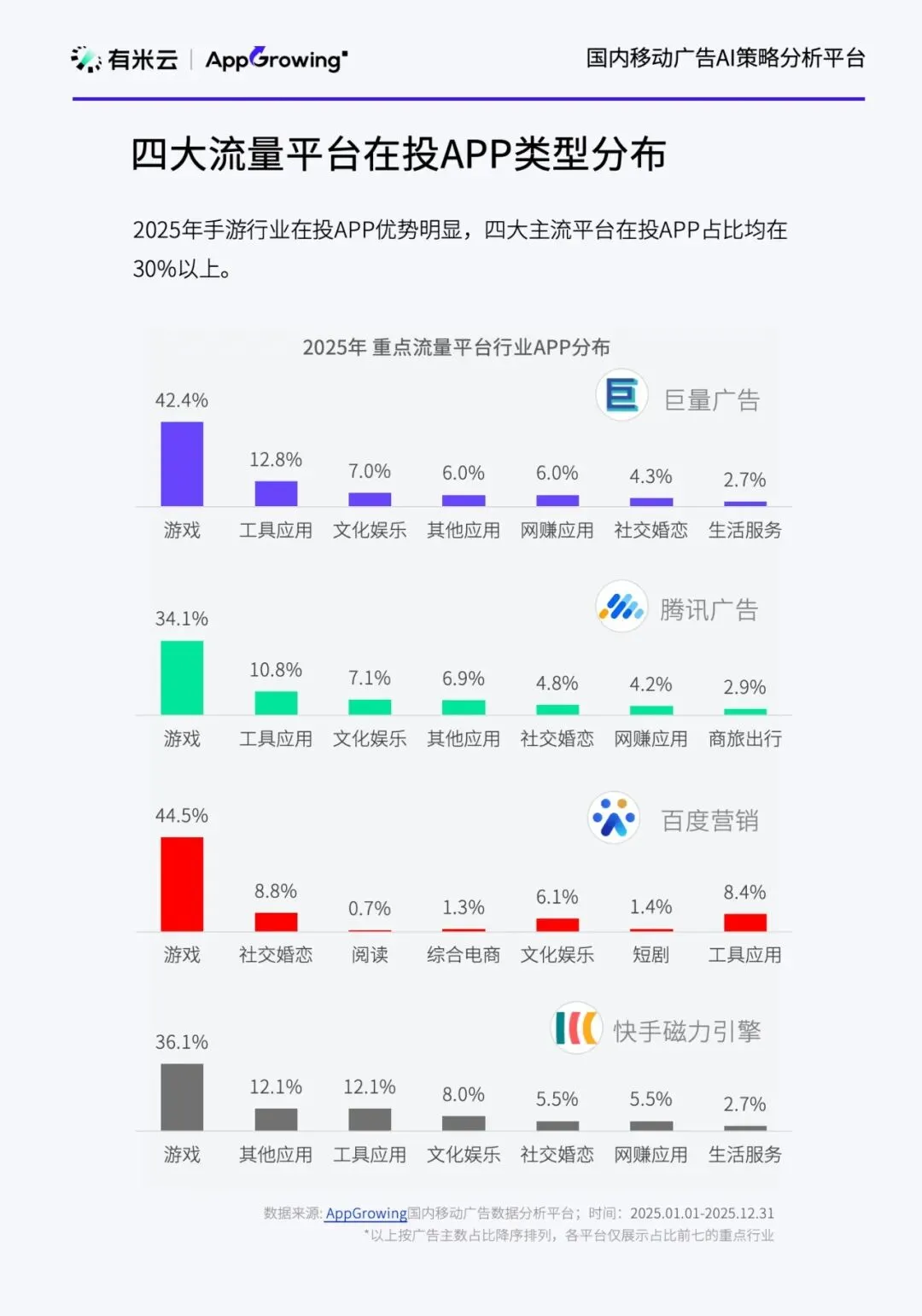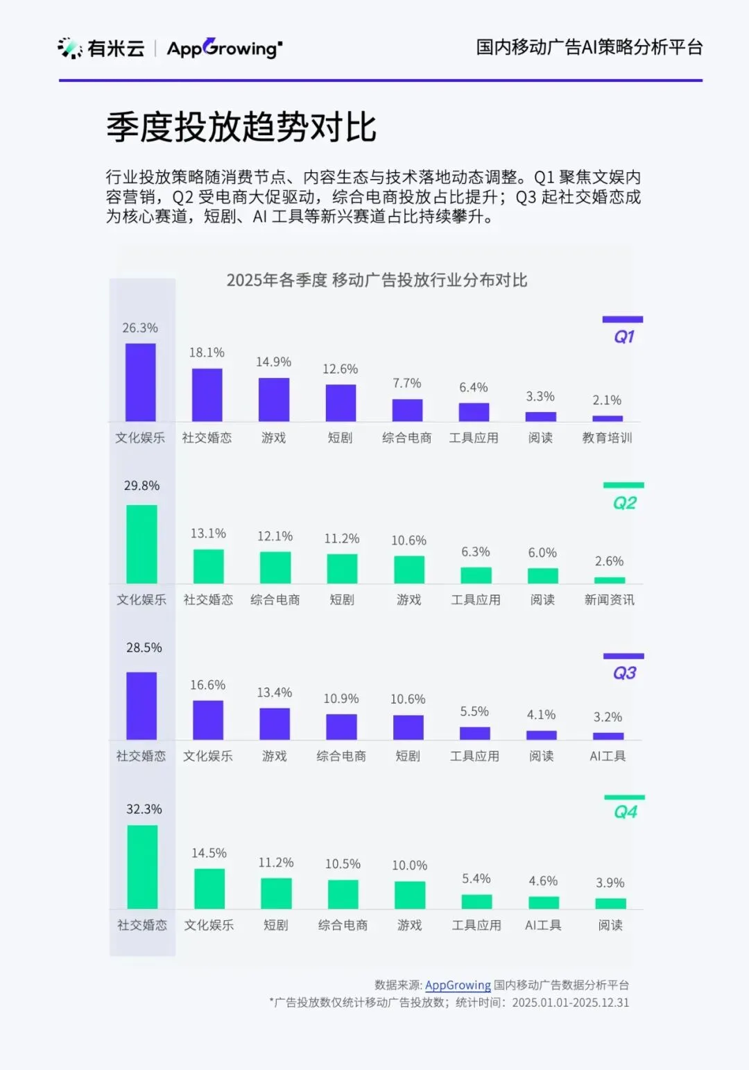 2025年全网移动广告投放量达近14亿,较2024年(7亿+)实现翻倍增长。 行业呈现显著结构性分化:社交婚恋、短剧类广告占比持续提升,而文娱、游戏、综合电商占比回落,反映行业从粗放买量转向精细化运营。 素材形态革新