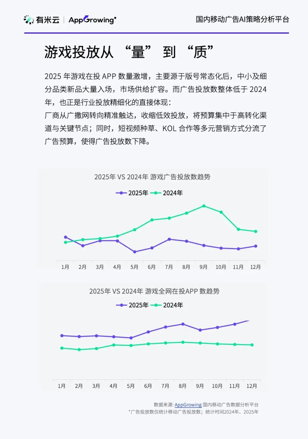 小游戏迈入“混合变现(IAA+IAP)+内容化”深水区,玩法向中重度及强社交属性延伸。 游戏在投APP数量激增,但广告投放数同比下降,反映厂商收缩低效渠道、聚焦高转化场景。
