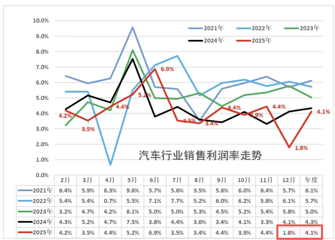 当然,尹同跃说的1.8%是去年12月份的数据,全年的数据好点——4.1%,相对于下游工业企业5.9%的利润率,汽车行业仍偏低。