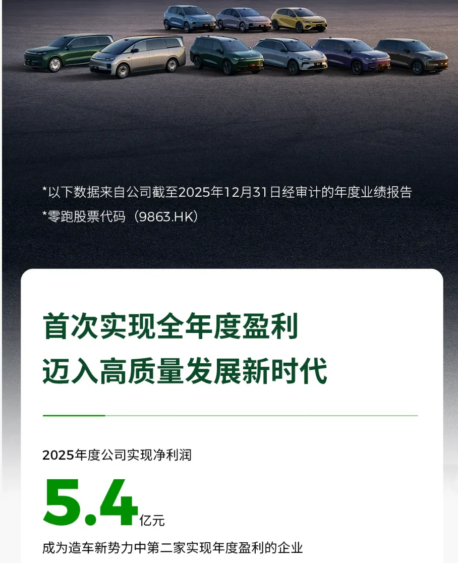 再举个零跑的例子,3月16日发布史上最强财报:2025年实现净利润5.4亿元,销量近60万辆,大概每台车赚了1000元;零跑已经行业的佼佼者,成为造车新势力的领头羊,今年还要冲击100万辆。
