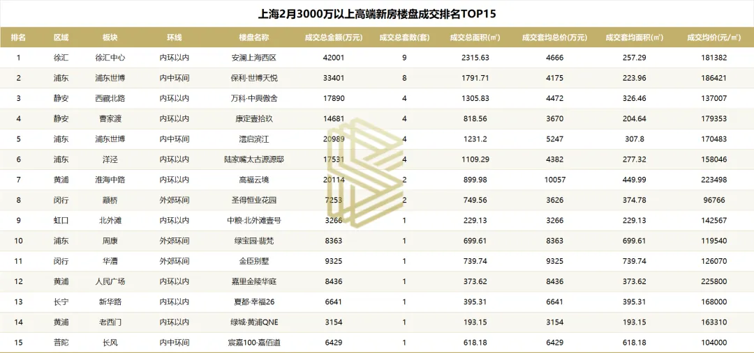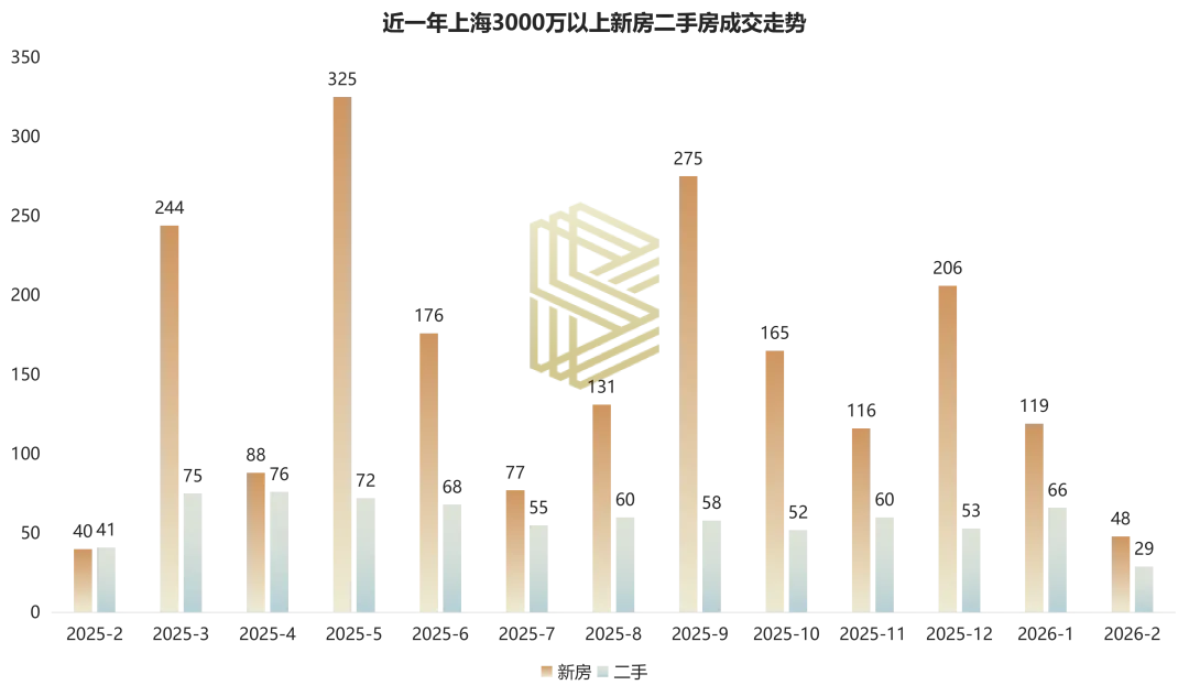 2026年2月,受传统春节淡季影响,上海总价3000万以上新房住宅成交节奏明显放缓,月成交48套,成交总金额25.1亿元,成交面积1.53万㎡。成交量环比下降59.6%,但同比上升20%。成交套均总价约为5230万元,环比上升7.3%;成交均价为16.3万元/㎡,显示出市场底部支撑力依然稳固。