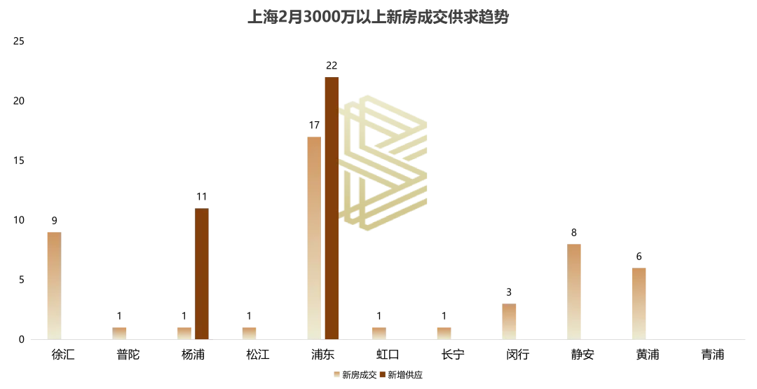 供应端同步收缩,全月仅44套新房入市,分别为浦东张江斯坦福花园、杨浦新江湾城建发海宸。截至2月28日,该价位段新房存量2300余套。