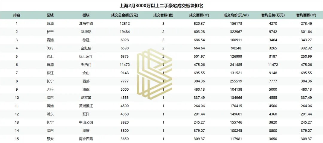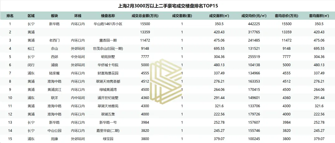 从楼盘来看,2月3000万以上二手成交房源呈现“多点开花、单套成交”的特点,所有成交楼盘均为单套交易,这进一步反映了当前二手豪宅市场高净值客户的“淘金”心态。其中一套来自华山路1461弄小区的房源,以1.55亿元总价、44.2万元/㎡的单价成交,位列榜首。