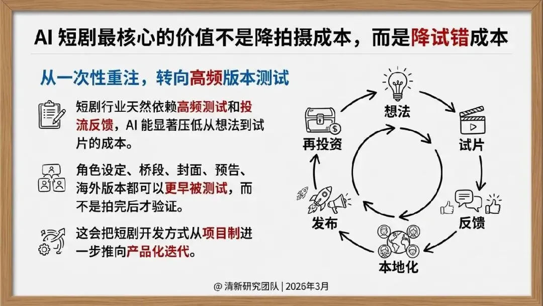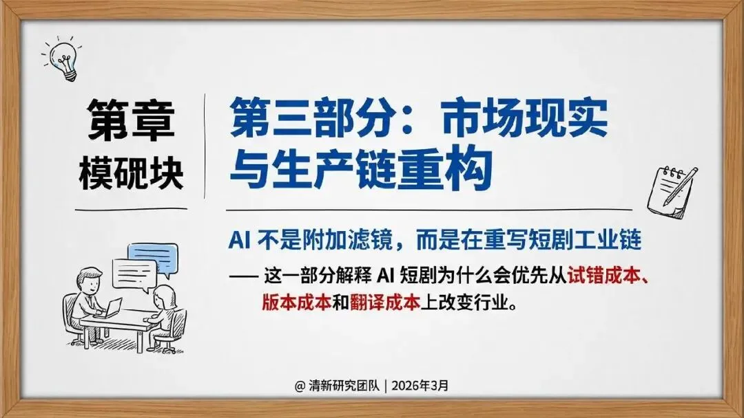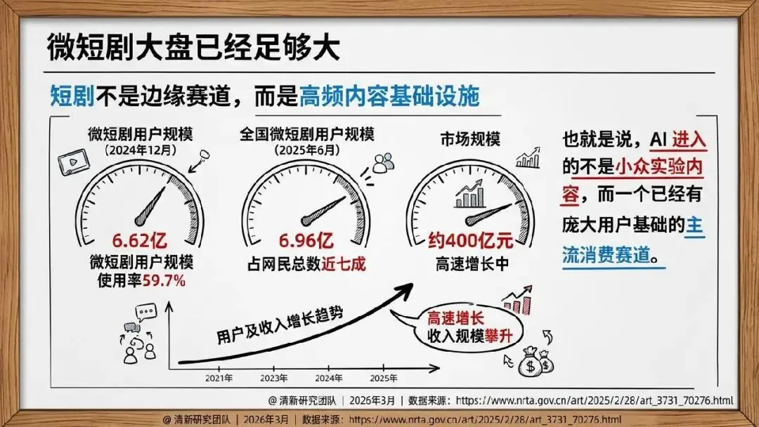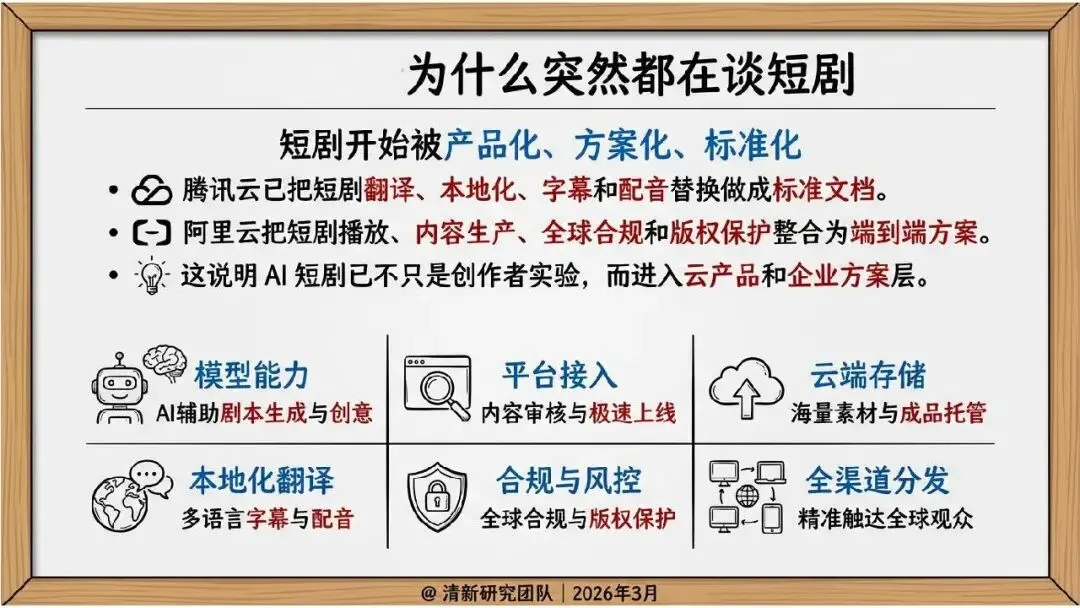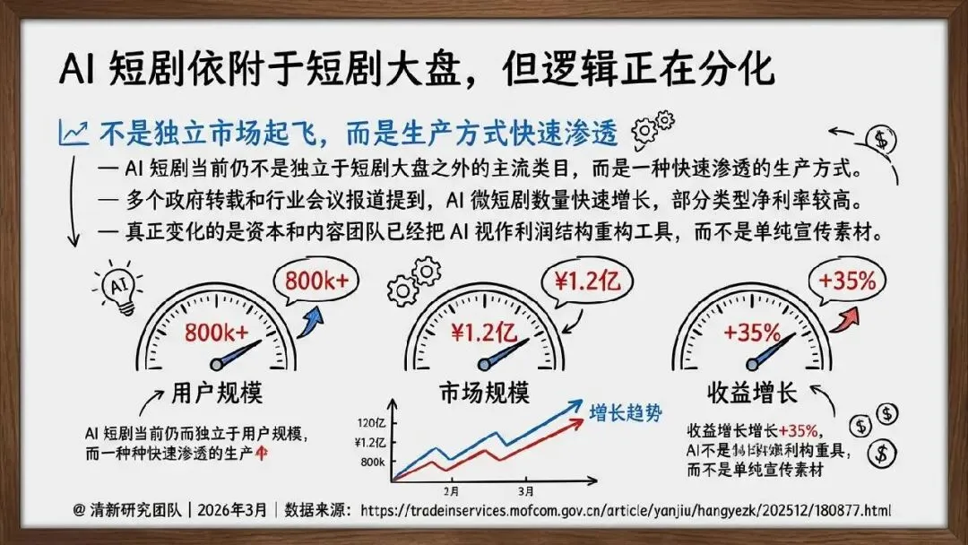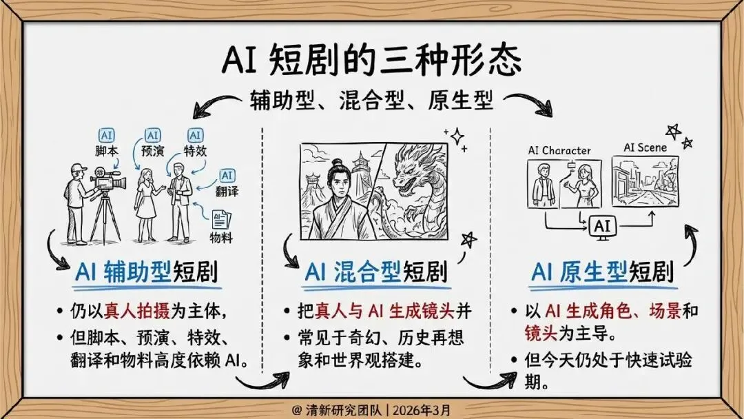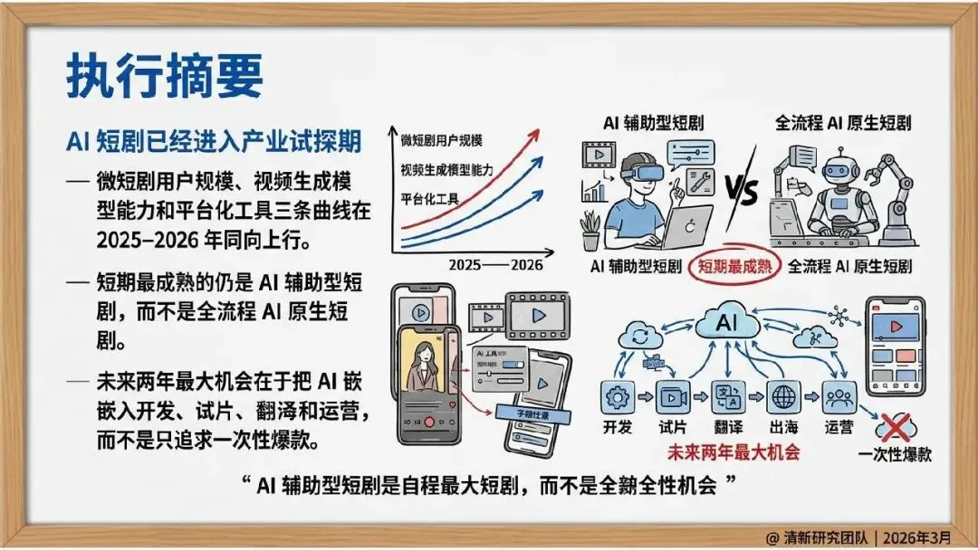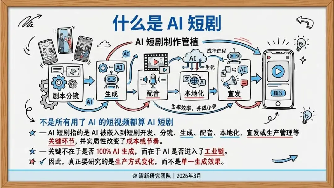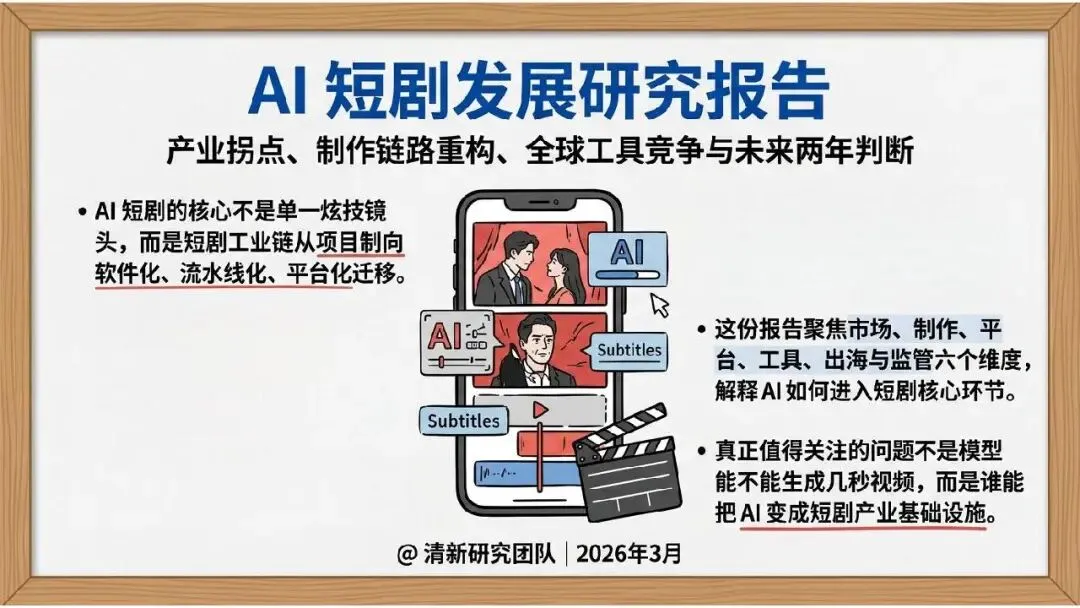 2026 年 3 月清新研究团队发布 AI 短剧发展研究报告,指出 AI 短剧核心是推动短剧工业链向软件化、流水线化、平台化迁移,当下行业已进入产业试探期。