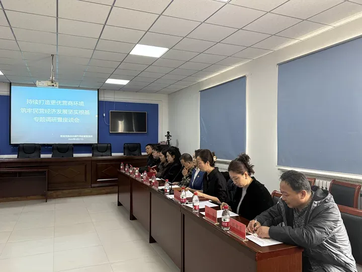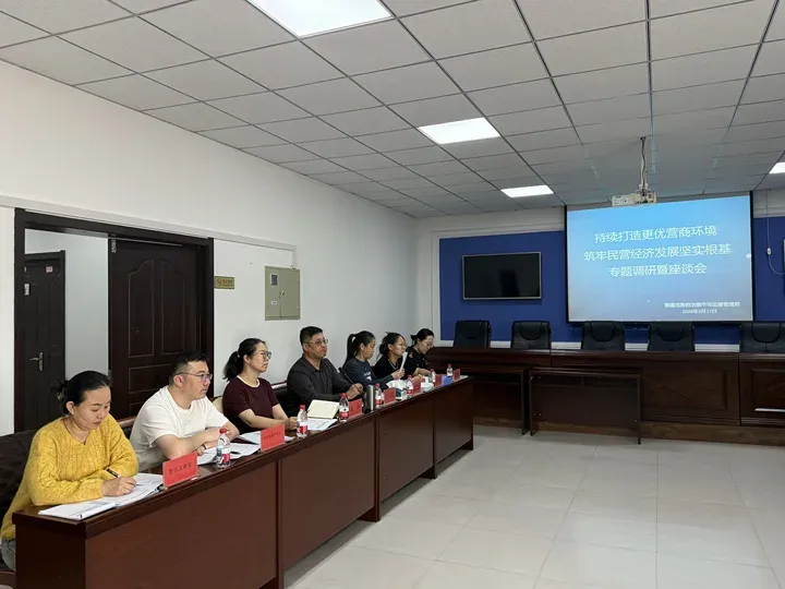 调研以座谈会形式进行。会议由旗市场监管局分管副局长主持,并全面汇报了市场监管领域优化营商环境工作推进情况、主要举措、工作成效及存在问题。相关股室负责人结合各自职能就市场准入、信用监管、公平竞争监管、知识产权保护、法治保障等工作作补充说明。