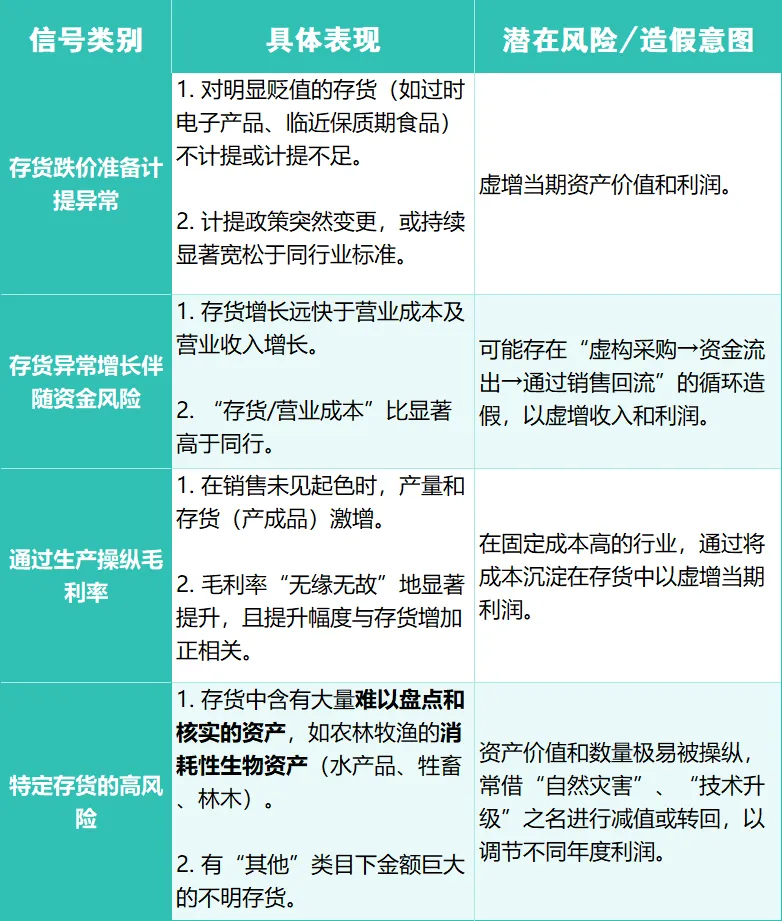 ②风险信号:如果存货增长大幅超过营业成本增长,这是一个强烈的危险信号。它可能意味着产品滞销导致的库存积压,也可能是更严重的财务造假迹象——例如通过虚构商品采购将资金流出体系。