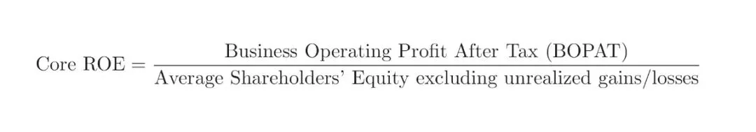 首先,核心ROE(Core ROE)的计算公式很简单:核心ROE = 税后营业利润 ÷ 平均股东权益(剔除未实现投资损益)。
