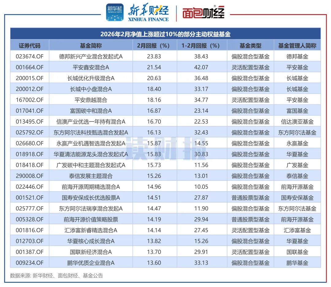 根据不完全统计,2026年2月,共有76只主动权益基金收益率超过10%,来自德邦基金、平安基金、长城基金等机构。