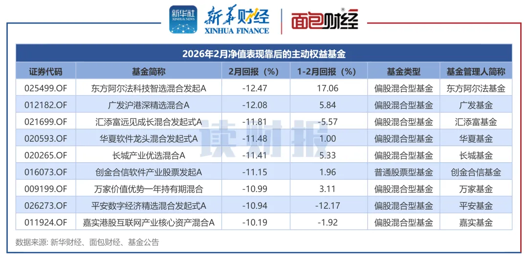 东方阿尔法基金、广发基金等旗下9只主动权益基金2月净值下跌超过10%,表现相对落后。