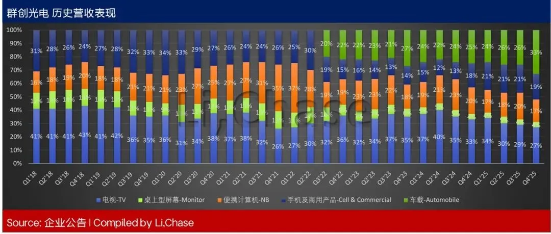 主要的收入主要来自于车载面板,其收入占比占整体收入的33%,达6亿美元,环比增加20%,环比增加45%。 其次是电视,其收入占比占整体收入的27%,达4.9亿美元,环比下降12%,同比下降10%。 第三是手机等屏幕,其收入占比占整体收入的19%,达3.47亿美元,环比下降15%,同比增加16%。 第四是便携计算机,其收入占比占整体收入的17%,达3.11亿美元,环比下降20%,同比下降6%。 第五是桌上显示屏,其收入占比占整体收入的4%,达0.7亿美元,环比下降6%,同比提高10%。