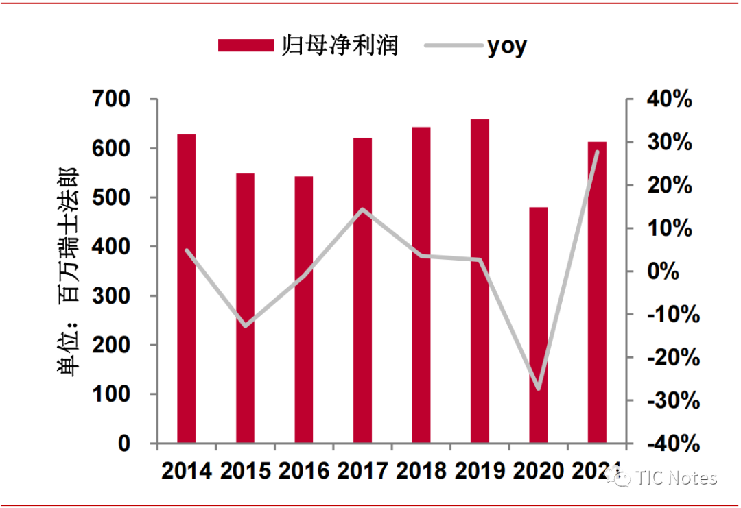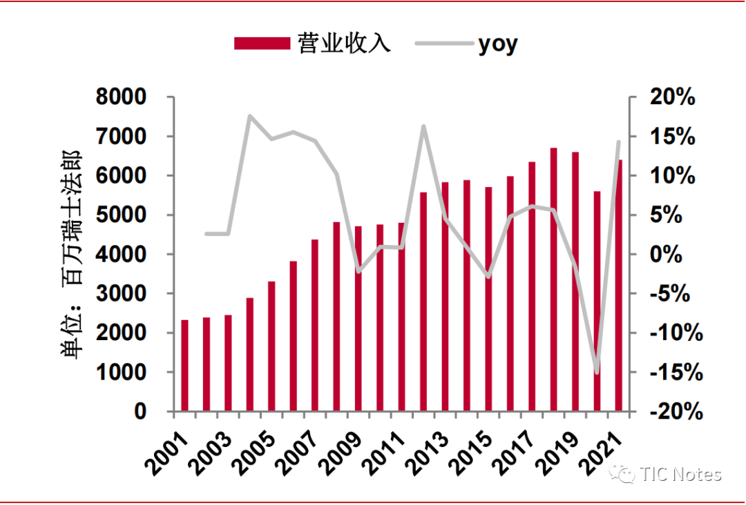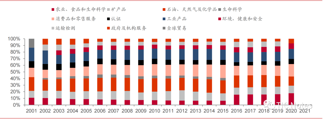 行业具有明显的伴生属性,细分行业不断更迭。随着传统细分行业趋于成熟,检测公司就会切入高速增长的新细分行业。以SGS为例,公司1878年成立,主要从事谷物贸易等农产品检测业务,后又逐步切入矿产、天然气等细分行业,其业务范围也从法国逐渐扩张到全球范围。2001年,石油、天然气、化工产品和工业产品检测的收入贡献超40%,但受到上游行业景气度下行影响,目前两者所占份额已不足30%。石油、天然气和化工产品业务的收入规模也从2018年最高的12亿瑞士法郎,缩窄至2021年的8亿瑞士法郎。取而代之的是农业、食品和生命科学板块的迅速增长,占比从2015年的 6.4%提升至2020年的17.8%。