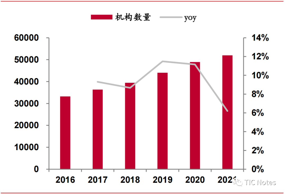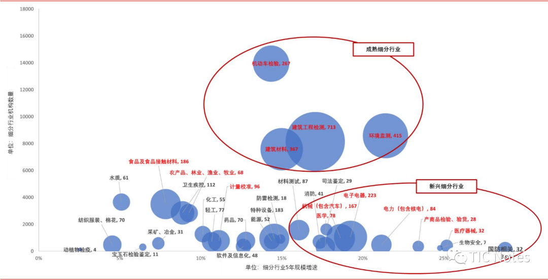 我们通过细分行业规模、细分行业规模增速、机构数量三个指标分别量化细分行业在行业空间、发展阶段、竞争壁垒上的差异。(1)机动车检验、建筑材料、建筑工程检验、环境监测等细分行业规模更大,增速在15-20%区间,但早期布局的机构较多,竞争较为激烈,分布在图的上方区域,是偏成熟的细分行业。(2)电子电器、汽车、医疗器械、国防相关等细分行业的规模较小,但增速更快,竞争格局更优,分布在图的右下方区域,是更具潜力的新兴细分行业。(3)水质、化工等细分行业增速较慢,体量较小,处于图中左下方区域。