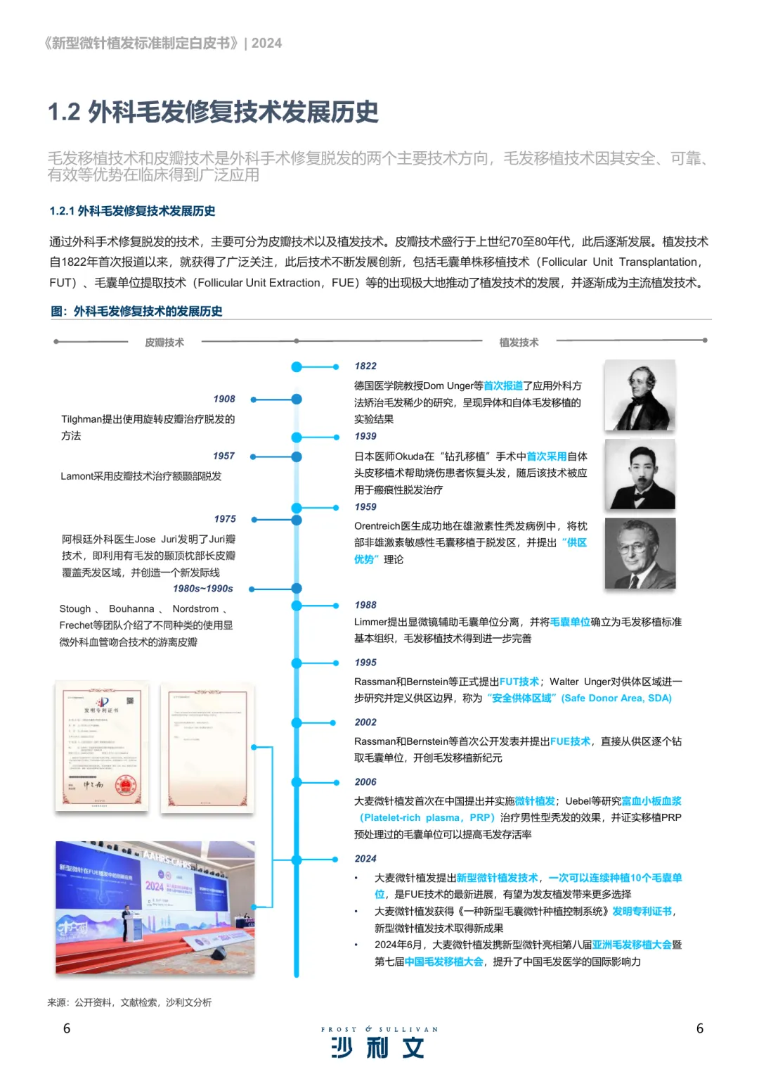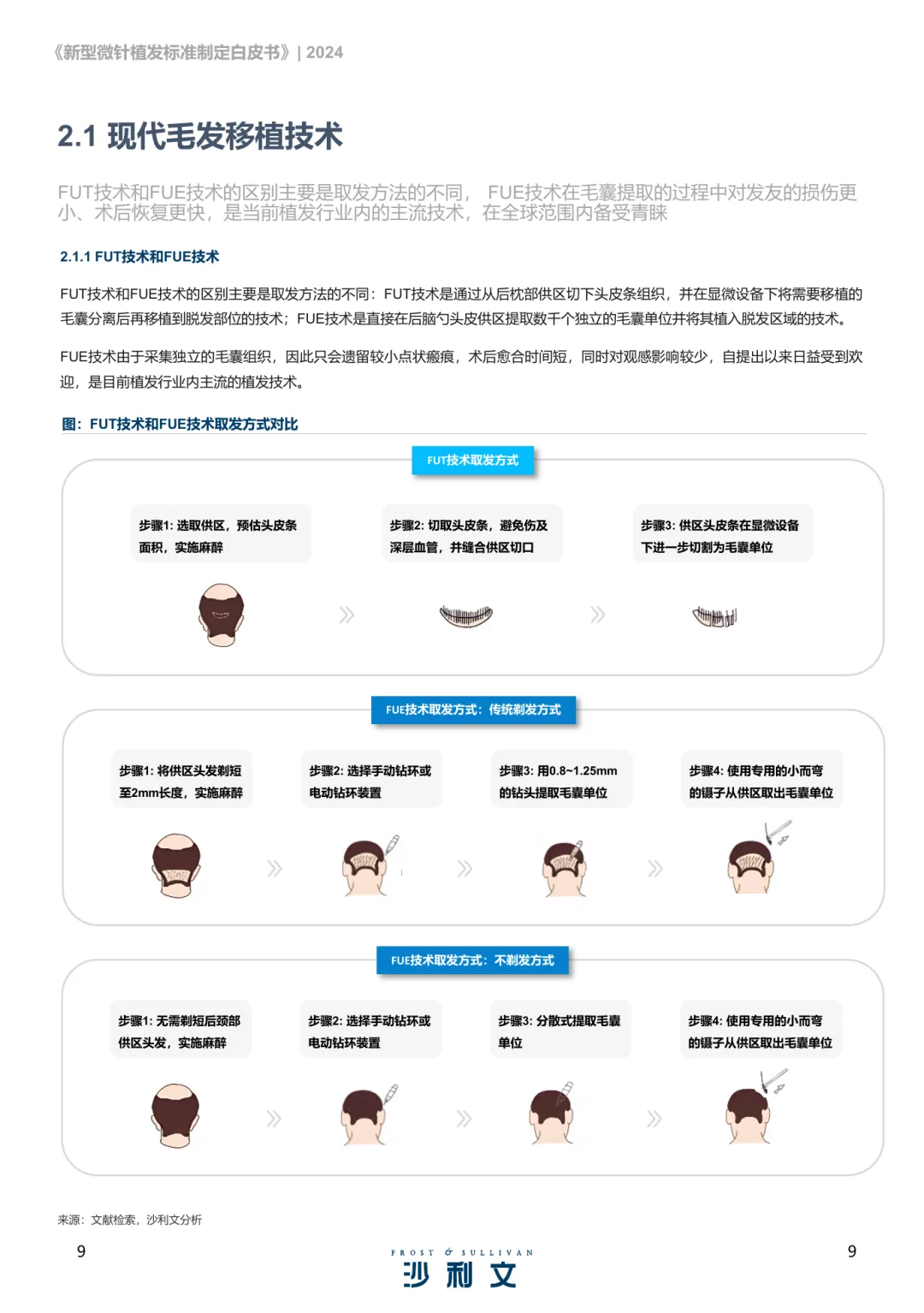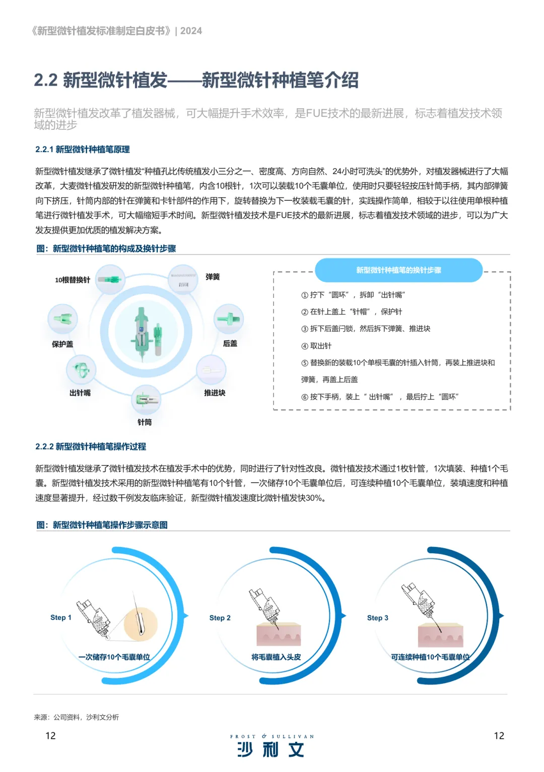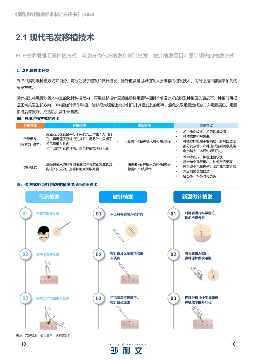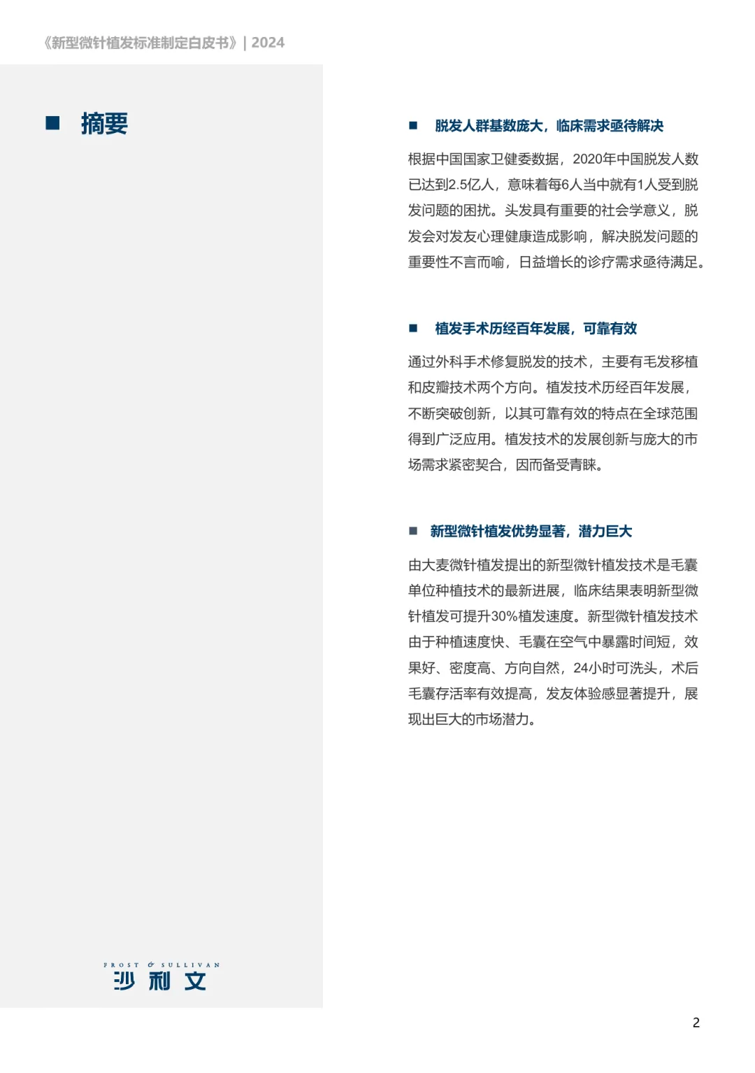 脱发问题已形成全球性挑战,中国2020年脱发人数达2.5亿,平均每6人中就有1人受其困扰。脱发不仅影响外貌,更对心理健康造成显著负面影响,尤其是年轻群体,其生活质量和情绪状态受到较大冲击。数据显示,30岁以下脱发人群占比超过半数,且这一趋势仍在加剧。毛发移植作为主要治疗手段之一,已有百年发展历史,技术不断演进,疗效稳定可靠,广泛应用于全球市场。其中,FUT与FUE是当前主流的植发技术,各自具有适应症和特点。随着技术进步,微针植发作为新一代技术应运而生,具备更高的效率与更好的术后体验。新型微针植发技术在种植速度、毛囊存活率、术后恢复时间等方面表现突出。相比传统方法,其操作更精细,毛囊暴露时间更短,术后效果更自然,发友满意度显著提升。该技术已在临床中取得良好成效,尤其在男性雄秃及女性美学不剃发案例中展现出独特优势。