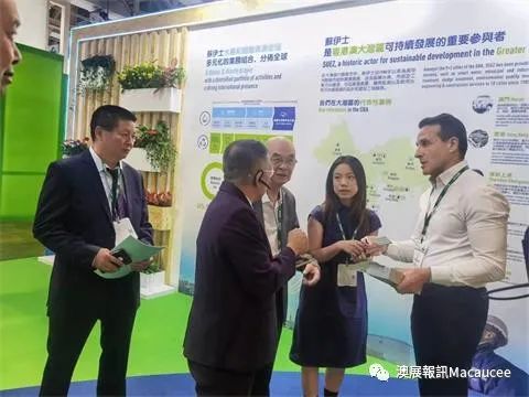 來自約旦蘇伊士亞洲地區粵港澳大灣區業務發展總監貝通,對該技術更是非常重視,親自與中國澳門——亞太拉美再生能源產業研發中心羅兆等一行人員,到澳門自來水公司展位,介紹蘇伊士為環境服務、涉及智慧水務、市政及工業污水處理、污泥處理處置、環境監督以及飲用水和污水處理的設計和建設工作服務。貝通希望能夠從中國澳門——亞太拉美再生能源產業研發中心的科研及設備得到更多的啟發與合作。