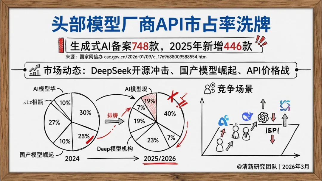 头部API竞争白热化:DeepSeek开源模型冲击市场,国产模型崛起引发价格战,2025年新增备案AI服务446款。