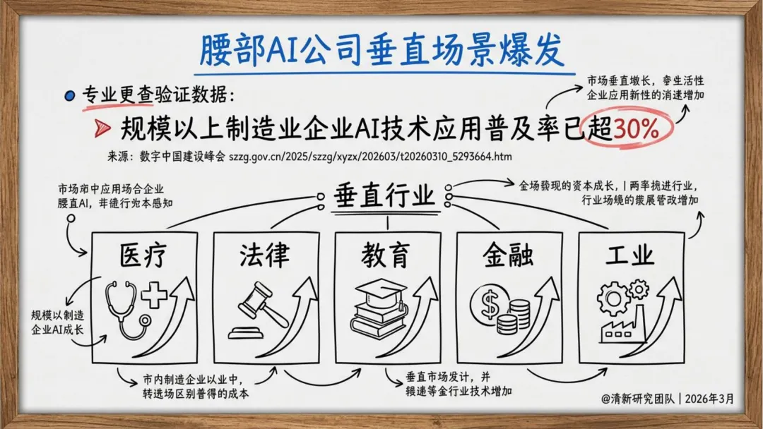 腰部公司垂直场景爆发:制造业AI应用普及率超30%(数字中国建设峰会数据),企业聚焦医疗、教育等细分领域。
