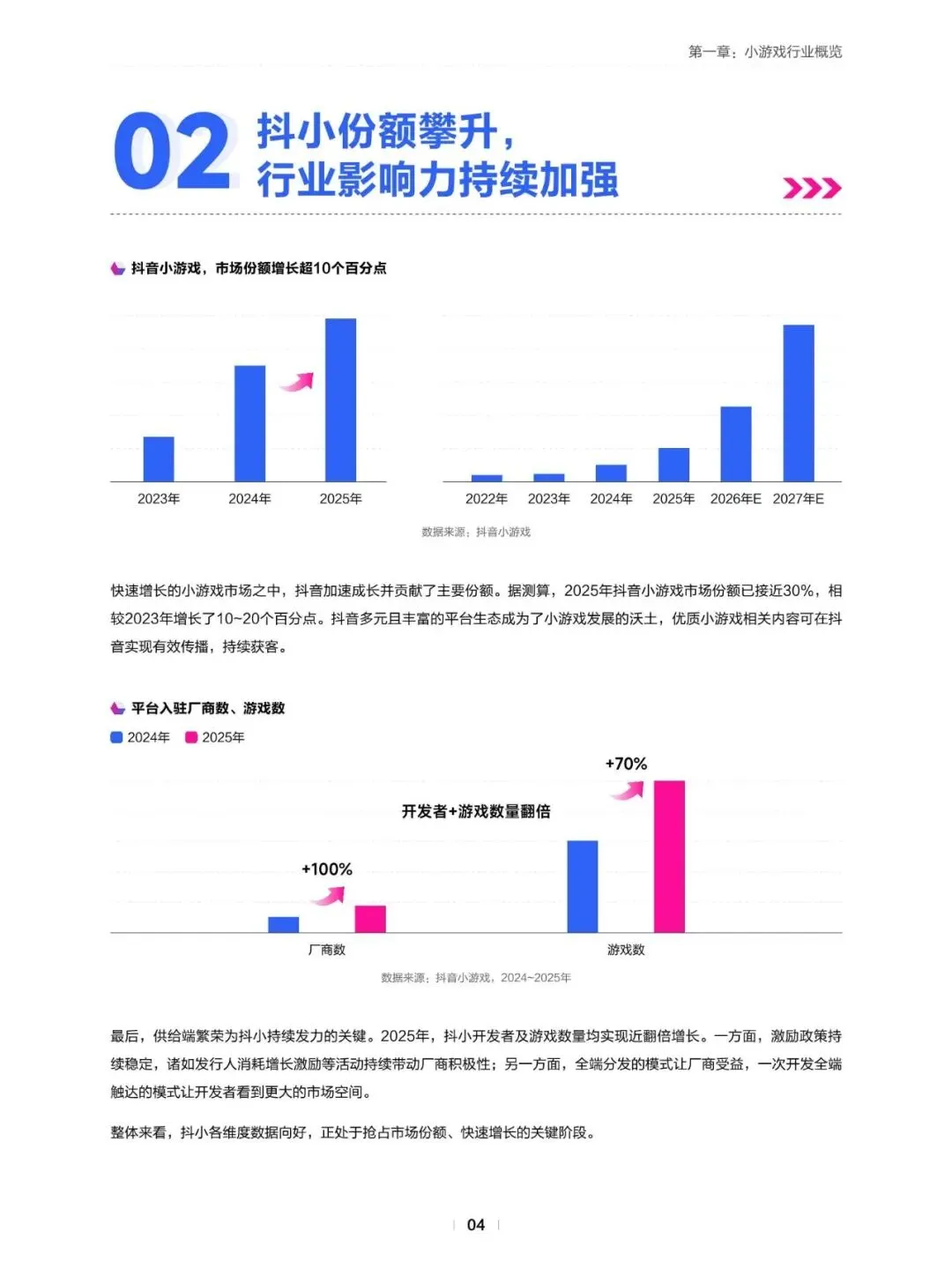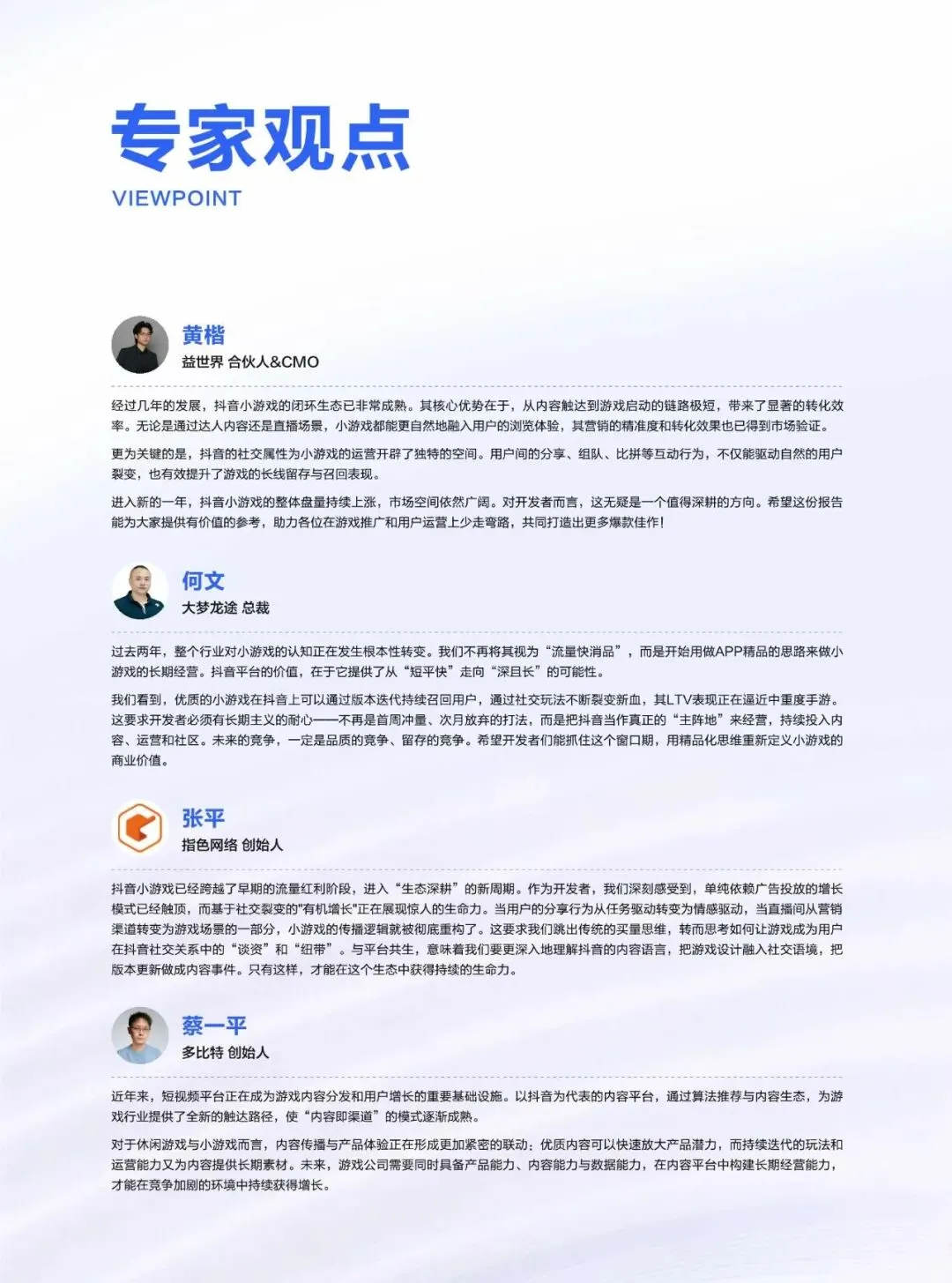 进入新的一年,抖音小游戏的整体盘量持续上涨,市场空间依然广阔。对开发者而言,这无疑是一个值得深耕的方向。希望这份报告能为大家提供有价值的参考,助力各位在游戏推广和用户运营上少走弯路,共同打造出更多爆款佳作!