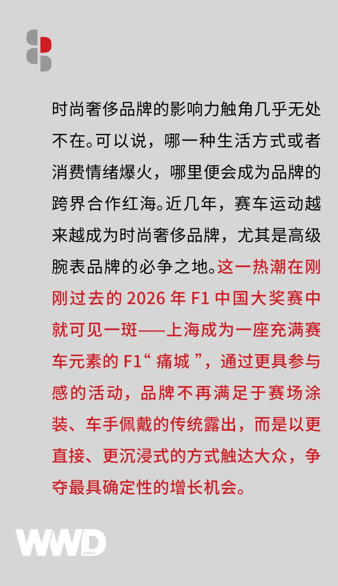 除了专业性和竞技精神,2026 赛季“赛车必须使用100%可持续燃料”的规则变革,以及越来越受关注的女性车手和占比不断攀升的女性观众,也为 F1 的价值挖掘带来了很多的可能性,尤其是在中国市场,腕表品牌与赛车运动之间的化学反应更加值得期待。WWD