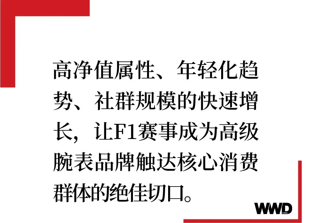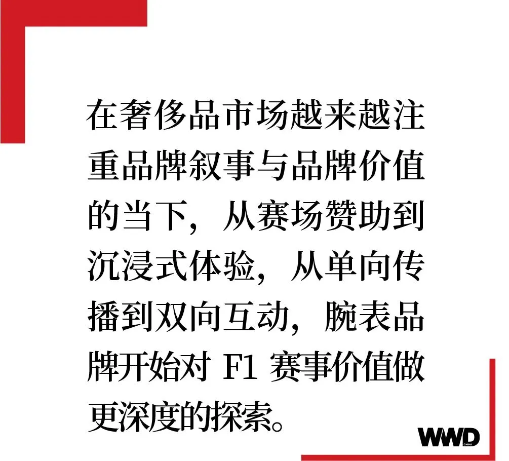 腕表品牌与赛车运动向来渊源颇深,在奢侈品市场越来越注重品牌叙事与品牌价值的当下,从赛场赞助到沉浸式体验,从单向传播到双向互动,腕表品牌也开始对 F1 赛事价值做更深度的探索。