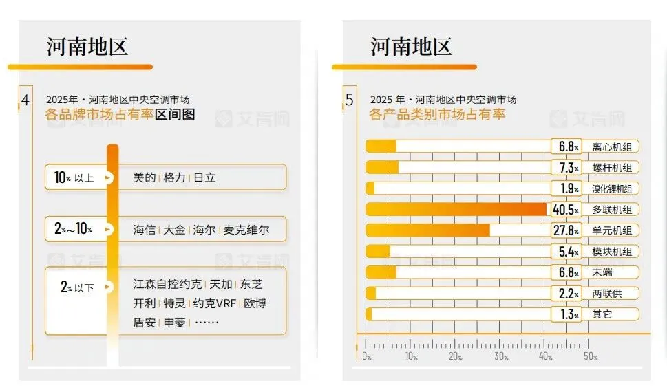 从产品需求来看,多联机与单元机合计占有近七成的市场份额,构成了绝对主流,精准匹配各类公建的基础需求;离心机占比6.8%、螺杆机占比7.3%,两类产品主要对应大型工业项目、数据中心等重载场景,需求仍然稳定;模块机占比5.4%、末端占比6.8%,两者对比上一年产品占比都略有微增;溴化锂、两联供占比则分别为1.9%和2.2%。这也进一步印证了河南市场工程为主、家装为辅同时存量更新的发展特征。