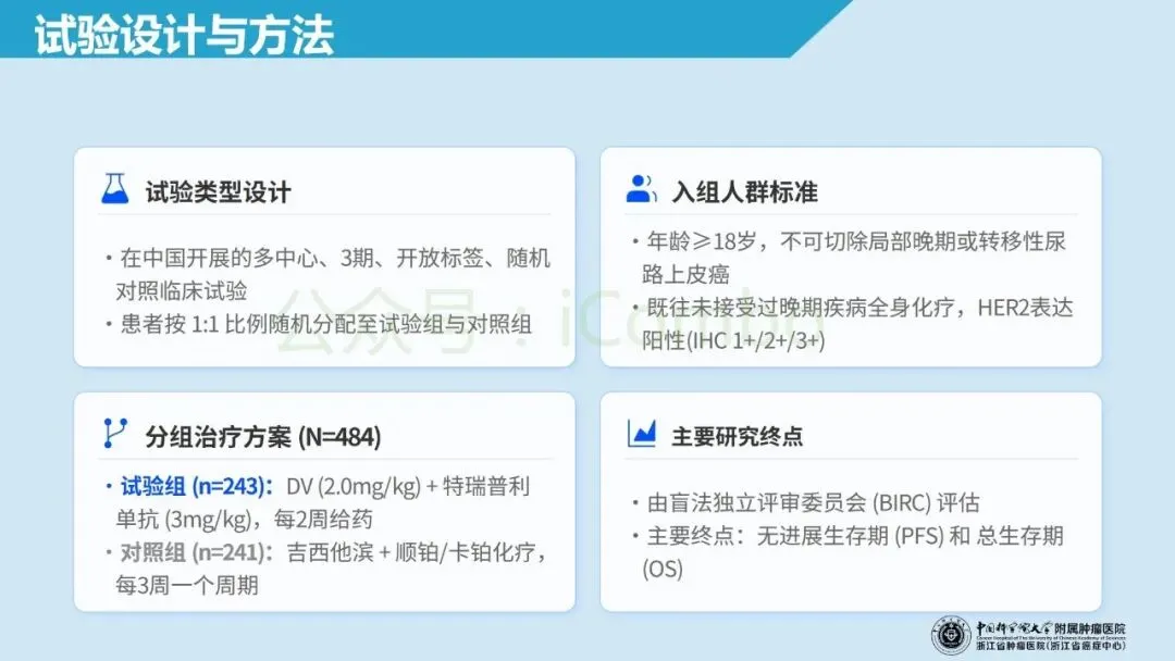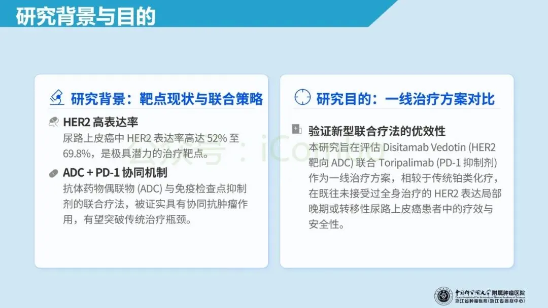 不可手术局部晚期或转移性尿路上皮癌的一线治疗长期依赖含铂化疗,或含铂化疗联合免疫检查点抑制剂治疗;但人群异质性大,且临床上相当一部分患者因肾功能或体能状态等原因不耐受含铂方案,治疗起手方案始终存在“疗效—耐受”的难以平衡。HER-2 过表达在尿路上皮癌中并非罕见分子特征,既往 HER-2 靶向的 ADC 单药(RC-48)已显示出初步临床活性,并获得国内适应症;而与 PD-1 免疫治疗联用也出现了令人期待的抗肿瘤信号,使得“HER-2-ADC + PD-1抗体 能否在一线建立新标准、以及 HER-2 低表达(IHC 1+)能否进入获益范围”成为一个直接而关键的问题。