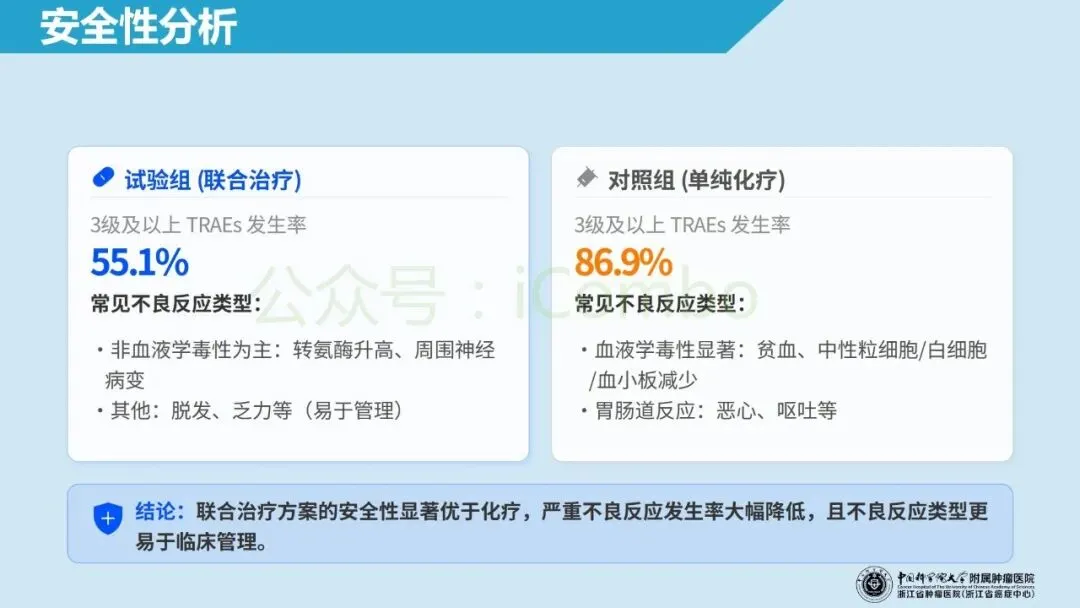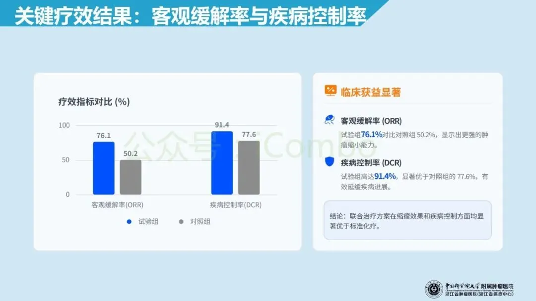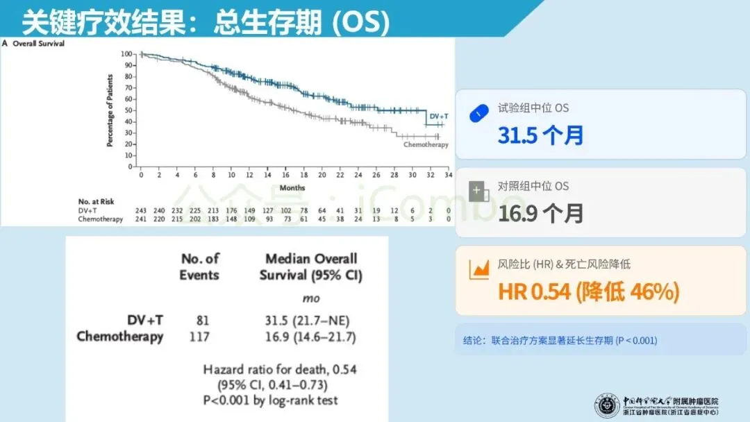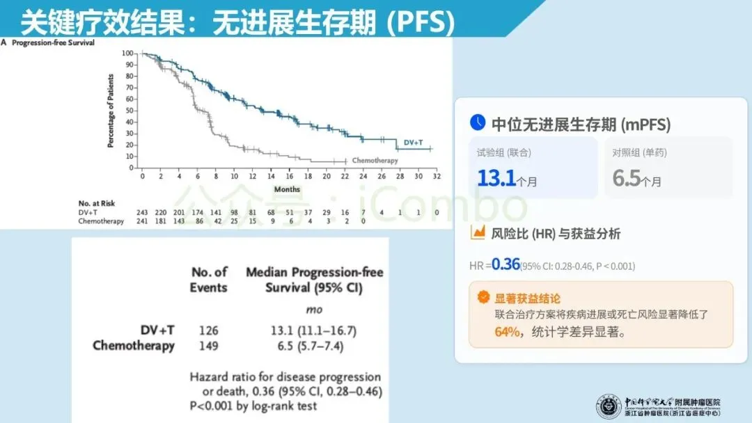 北京大学肿瘤医院郭军教授领导的RC48-C016 Ⅲ期多中心开放标签随机对照试验纳入 HER-2 表达(IHC 1+/2+/3+)的不可手术的局部晚期或转移性尿路上皮癌初治人群,1:1 分配至 维迪西妥单抗(disitamab vedotin 2.0 mg/kg)联合特瑞普利(toripalimab 3 mg/kg/2周)或吉西他滨联合顺铂/卡铂(每3周),双主要终点为盲态独立评审的无进展生存期(PFS)与总生存期(OS)。在中位随访 18.2 个月、共 484 例随机入组的预设分析中,联合组中位PFS为 13.1 个月(化疗组 6.5 个月;HR 0.36),中位OS为 31.5 个月(化疗组 16.9 个月;HR 0.54),均显著优于化疗;同时客观缓解率更高(76.1% vs 50.2%),且≥3级治疗相关不良事件比例更低(55.1% vs 86.9%)。这些结果支持将 HER-2 IHC 作为可落地的一线分层入口,并为“HER2-ADC + 免疫”在尿路上皮癌中的前移应用提供了强有力的循证依据。