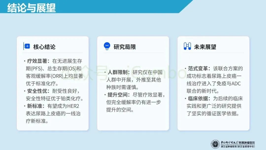 至此,在国内尿路上皮癌一线的方案进入ADC联合免疫的年代,对于HER2表达阳性的患者可选用上述HER-2ADC联合免疫方案;Nectin-4 ADC联合免疫治疗是另外一个可选择方案;两种方案谁更优,尚不可得知,需要根据头对头研究结果来判断。可以猜想的是两种ADC的PAYLOAD类似,估计会存在交叉耐药现象;总之含铂化疗不再作为尿路上皮癌一线唯一的选择(N Engl J Med. 2025 Dec 11;393(23):2324-2337.doi: 10.1056/NEJMoa2511648)。