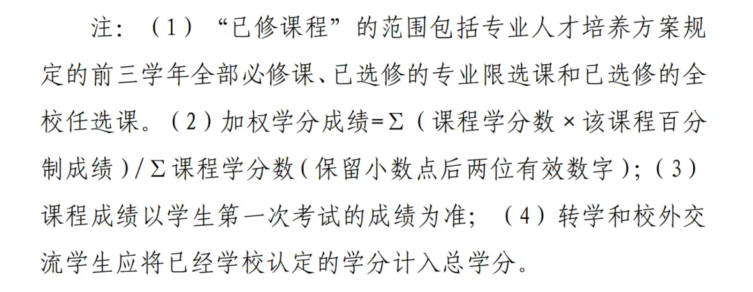 前三学年必修课(含集中实践类)不得有补考和重修科目,前三学年已修课程(含集中实践类)加权学分成绩须名列所在专业所有学生前 20%(含 20%)。