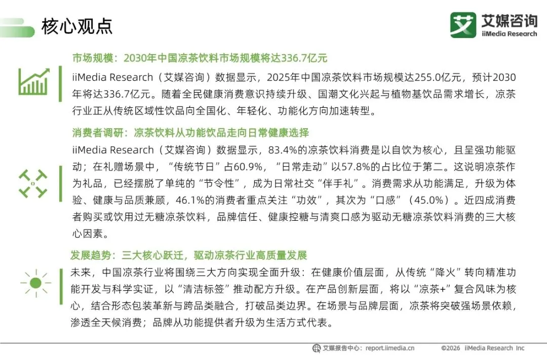 这份由艾媒咨询发布的《2026年中国凉茶饮料消费趋势洞察白皮书》是一份全面、深入且具有前瞻性的行业分析报告。以下是对其核心内容、逻辑框架与行业洞见的解读分析:报告开宗明义,指出中国凉茶行业已从粗放增长期进入“精耕细作的存量博弈期”,未来的增长核心在于完成从“传统凉茶”到“现代健康植物饮品”的价值重塑。围绕这一核心,报告构建了“背景-现状-消费者-未来”的完整分析链条,并最终提炼出驱动行业高质量发展的三大核心跃迁方向:健康内涵深化与功能价值精准化、产品多元化以打破品类边界、消费场景拓展与品牌心智重塑。这三大趋势构成了报告对未来判断的骨架。报告数据显示,2025年市场规模为255.0亿元,预计2030年达336.7亿元,市场进入稳步增长阶段。增长动力主要来自两个方面:• 结构性机会(下沉市场与增量场景):三四线及县域市场的消费潜力释放,以及家庭储备、办公、户外等新消费场景的拓展,是规模扩大的重要基础。• 价值性机会(无糖化与高端化):无糖凉茶已成为行业转型的关键赛道,近四成消费者已有消费行为。同时,消费者愿意为“更好的凉茶”(如更好口感、更多功能、更优成分)支付溢价,这为产品升级和高端化提供了市场空间。报告对消费者进行了细致入微的画像与分析,揭示了深刻的变化:• 消费动机日常化:83.4%的消费以自饮为核心,凉茶从“去火良药”转向日常健康饮品。礼赠场景中,日常走动占比(57.8%)接近传统节日(60.9%),成为日常社交“伴手礼”。• 决策因素多元化:消费者选择时最关注“功效”(46.1%)和“口感”(45.0%),但对“配料成分”(39.2%)和“产地原料”(37.3%)也高度敏感,呈现“功效优先、体验为核、成分敏感”的特点。• “信任”是核心货币:无论是传统品牌(依赖历史信任),还是无糖新品(面临“无糖”真实性疑虑),建立和维持信任是品牌的生命线。王老吉在整体满意度、功效体验等多维度领先,印证了这一点。• 场景驱动理性选择:消费者对不同包装(罐、盒、瓶)有清晰的场景化认知,如罐装用于礼品、盒装用于家庭囤货、瓶装用于外出,选择极为理性。• 市场高度集中:王老吉与加多宝构成双巨头第一梯队,和其正等为第二梯队,区域品牌及创新品牌构成长尾。王老吉在盒装市场占据绝对领先地位。• 产业链协同进化:报告指出,产业链协同正从初级的“保障供应”迈向未来的“数字化生态与价值共创”。上游通过科技(如DNA条形码技术)解决原料鉴定难题;中游通过工艺创新(如解决无糖口感问题)和“凉茶+”进行产品创新;下游消费数据及健康趋势则反向驱动上游种植与中游研发。报告以王老吉为标杆,系统阐释了一个凉茶头部品牌的完整发展路径:从开创品类(绿盒、红罐),到推动价值升级(“本草轻养生”、无糖化、品类延伸),再到启动全球化征程(PCBC模型、供应链本土化、文化出海)。这为行业提供了从产品到品牌,再到生态构建的可参考范式。• 健康精准化:从泛泛的“降火”转向针对细分人群(如舒压、护眼)的精准功能开发,并依赖“清洁标签”和科学实证建立信任。• 产品无界化:以“凉茶+”为核心,与气泡、果味、茶咖等融合,并探索冻干粉、浓缩液等新形态,甚至与酒精、新茶饮进行品类跨界。• 场景全天候与品牌心智化:突破餐饮、夏季的强依赖,渗透办公、运动、居家等全时段场景。品牌沟通从功能诉求升维至情感联结(如“吉文化”)和生活方式代言,并深度融合数字化营销。本报告数据详实、结构清晰、洞察深刻,不仅系统梳理了凉茶行业的过去与现在,更精准指出了在健康消费与国潮文化背景下的转型路径与未来机遇。它明确指出现阶段行业的根本矛盾在于:传统的“甜蜜负担”与陈旧形象,同新一代消费者对健康、清爽、多元体验及文化认同的需求之间的矛盾。破局的关键,在于通过无糖化、功能细分、口味创新解决产品力问题,通过全场景渗透和品牌价值升维解决心智占位问题。报告对任何关注中国快消品、健康食品或国货品牌发展的相关人士,都具有极高的参考价值。部分内容预览