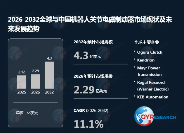 根据QYR(恒州博智)的统计及预测,2025年全球机器人关节电磁制动器市场销售额达到了2.12亿美元,预计2032年将达到4.30亿美元,年复合增长率(CAGR)为11.1%(2026-2032)。