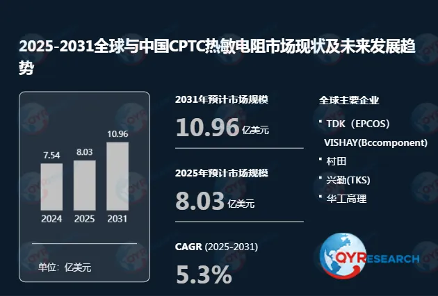根据QYR(恒州博智)的统计及预测,2024年全球CPTC热敏电阻市场销售额达到了8.03亿美元,预计2031年将达到10.96亿美元,年复合增长率(CAGR)为5.3%(2025-2031)。