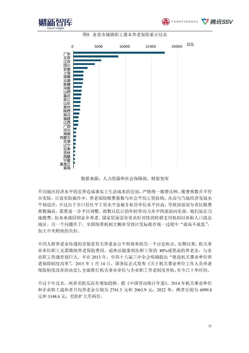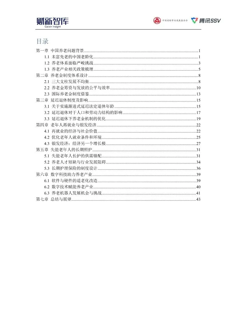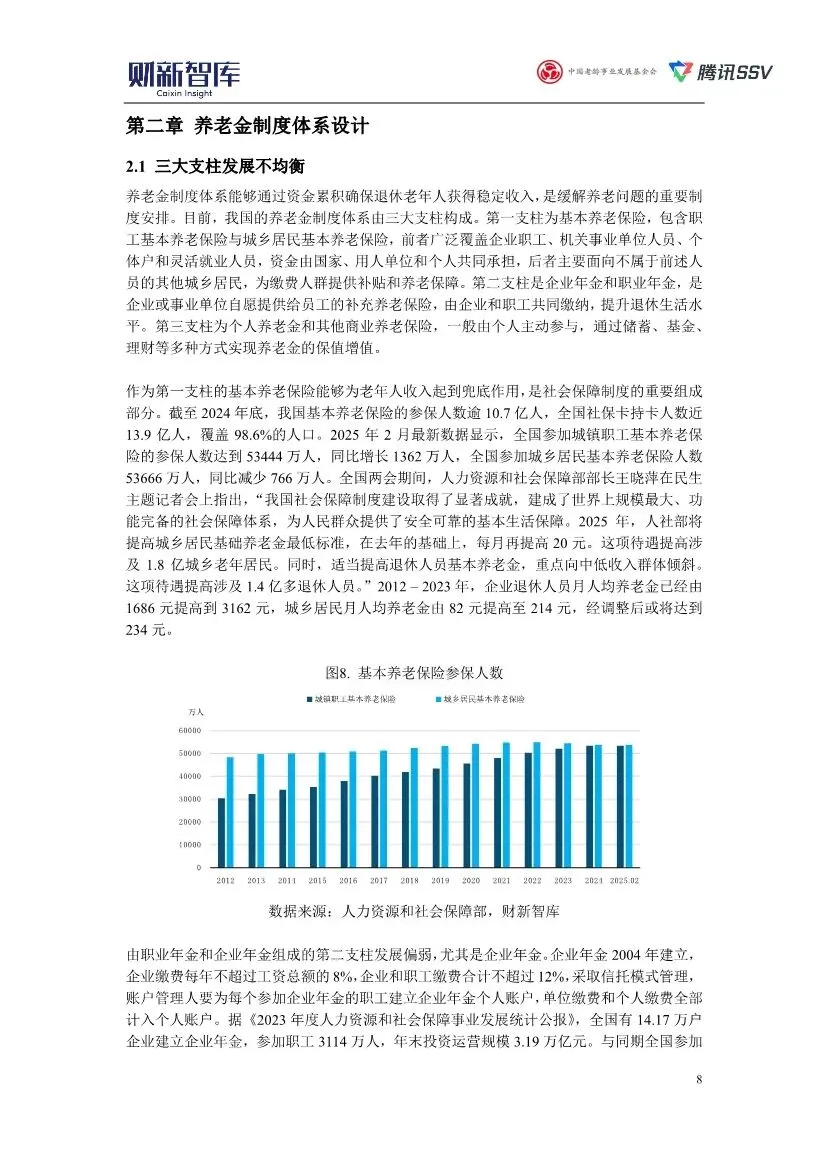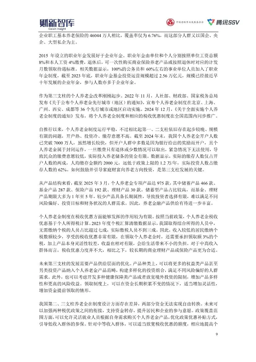 这份由财新智库、中国老龄事业发展基金会与腾讯SSV联合发布的《2025中国养老产业研究报告》,是一份系统全面、数据详实且具有极强现实针对性的深度行业研究。以下是对其核心内容、逻辑框架与关键洞见的解读分析:1. 核心论断与逻辑主线:在“未富先老”的严峻挑战下,构建系统性应对方案报告开宗明义,将 “未富先老” 确立为中国人口老龄化的根本特征与核心挑战。以此为核心,报告构建了“问题诊断-压力分析-系统性应对”的清晰逻辑主线:首先,用详实数据刻画了老龄化加速(如2024年60岁及以上人口占22%)与“未富先老”(进入中度老龄化时人均GDP不足1.3万美元)的现实;其次,深入剖析了由此对社会保障体系(养老金收支压力加剧、2023年社保基金支出占收入比重达87.7%)、劳动力市场(劳动年龄人口减少)、经济增长(削弱国际竞争力)和家庭照护(失能老人约3500万)带来的多维冲击;最后,系统性地提出了养老金改革、延迟退休、老年人再就业、发展银发经济、健全长期照护体系、发挥数字科技作用这六大应对方向。整个报告犹如一份针对“老龄化”这一系统性社会问题的综合诊疗与处方。2. 核心问题深度剖析:养老金体系的公平、可持续与多层次挑战报告用大量篇幅和数据分析了中国养老金的三大核心矛盾:• 三大支柱严重失衡:第一支柱(基本养老保险)已近全覆盖,但可持续压力巨大;第二支柱(企业/职业年金)覆盖率极低(企业年金仅6.76%);第三支柱(个人养老金)面临“开户热、投资冷、缴存意愿不高”的困境,人均缴存仅约2000元,远低于1.2万元上限,税收优惠对中低收入群体激励不足。• 公平性挑战突出:揭示了养老金待遇在地域(东部结余多、中西部及东北地区需中央调剂)、人群(机关事业单位、企业职工、城乡居民月均养老金差距悬殊,2022年分别为6099.8元、3148.6元、204.7元)和城乡(农村老年人主要靠家庭供养或劳动收入)之间的巨大鸿沟。• 改革路径借鉴:报告专章分析了美国、新加坡、德国、日本(特别是其养老金投资基金GPIF的市场化运营)的国际经验,为我国养老金改革,尤其是在市场化投资、多层次体系建设、财政补贴与个人责任平衡等方面提供了重要参考。3. 关键政策与市场趋势:延迟退休、银发经济与长期照护• 延迟退休的影响预判:报告肯定了2025年起实施的渐进式延迟退休政策对缓解劳动力短缺和养老金压力的短期作用,但没有回避其复杂性。它深入分析了政策对不同行业(对高技能、经验依赖型行业利好,可能挤压服务业年轻人就业)和不同劳动者(重体力劳动者、健康状况不佳者面临挑战)的差异化影响,并提出了配套优化建议,如“早退折扣、延退补贴”、探索“隔代抚育抵扣缴费”等,体现了政策的精细思考。• 银发经济的战略定位:报告将银发经济明确定位为“经济的另一个增长极”,预计规模将从2023年的约7万亿元增长至2035年的30万亿元。它不仅关注“老年阶段”的医疗健康、养老服务,更前瞻性地纳入了“未老阶段的备老经济”。报告特别指出了老年旅游(2023年银发旅游者11.6亿人次,偏好错峰出游)、线上消费(老年网民1.71亿,网络支付使用率75.4%)等新兴增长点的巨大潜力,同时也指出了产品供给不足、质量参差不齐等短板。• 失能老人照护的供需困局:报告尖锐地指出,在“9073”养老格局下,失能老人长期照护存在严重供需错配。需求侧,家庭购买力不足(机构养老费用对农村居民是可支配收入的2.2倍);供给侧,养老机构倾向服务健康老人,专业护理人员极度短缺(潜在需求超1000万,在岗仅30多万),且工作强度大、待遇低、流失率高。报告将建立和完善长期护理保险制度视为破局关键,但客观指出了当前试点中筹资渠道单一(依赖医保基金)、覆盖范围有限、保障水平不足、存在道德风险等挑战。4. 科技赋能:从“适老化改造”到“养老机器人”的务实展望报告肯定了数字技术在适老化改造、健康监测、互联网诊疗等方面的积极作用,但持有务实而审慎的态度。它指出,高端智慧养老设施因成本问题难以普惠,软件适老化改造仍存在数字鸿沟。对于备受关注的养老机器人,报告明确区分了护理、康复、陪伴三类机器人的发展现状,指出当前护理机器人在灵活性、安全性上远未达到独立使用标准,陪伴机器人的情感交互能力有限,且高昂成本是产业化推广的主要障碍。这种基于技术成熟度和市场现实的评估,避免了盲目乐观。报告在最后强调了应对老龄化需要系统性的政策机制改革,包括:深化养老金改革(尤其强化第二、三支柱)、优化基本养老服务供给、培育社区养老、完善长期护理险、大力发展银发经济、创造适老就业岗位、发挥数字技术作用。它同时也清醒地指出当前养老产业存在政策碎片化、产业生态不完整、投资周期长回报低、社会资本进入意愿不强等深层问题。本报告不仅仅是一份产业分析,更是一份基于扎实数据、具有强烈问题意识和政策洞察的“国情咨文”。其核心价值在于:1. 系统性:将老龄化视为一个牵一发而动全身的系统性工程,进行了跨经济、社会、民生、科技的综合分析。2. 精准性:用大量最新数据揭示了养老金失衡、照护供需错配等核心矛盾的严峻程度。3. 建设性:每一项挑战都对应着具体的、借鉴国际经验并结合国情的政策建议和市场方向指引。4. 客观性:对延迟退休的复杂影响、银发经济