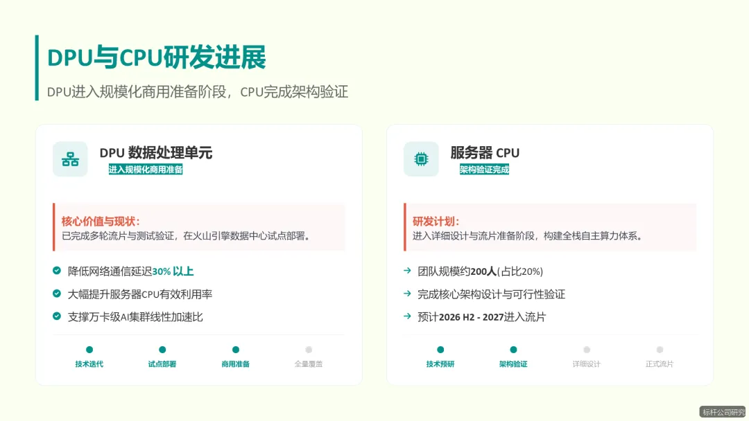 截至 2026 年 2 月,该 DPU 芯片已完成多轮技术迭代与测试,与自研 AI 推理芯片 SeedChip、服务器 CPU 形成了技术协同,能够共同构建完整的服务器算力体系。同时,该芯片也已在火山引擎的部分数据中心完成试点部署,进入了规模化商用的前期准备阶段。