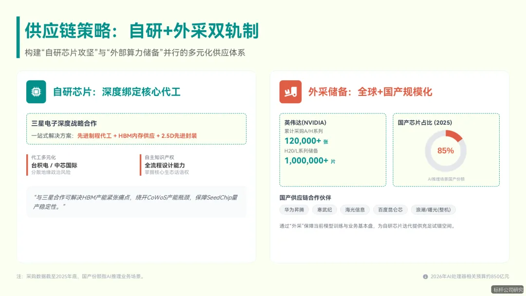 2024 年 6 月,路透社首次披露,字节跳动与美国芯片设计公司博通(Broadcom)合作开发先进 AI 处理器,制造环节原计划外包给台积电,这一合作项目聚焦于高端 AI 训练芯片的研发,旨在解决大模型训练环节的算力瓶颈。同年,The Information 披露,字节跳动制定了明确的芯片自研目标,计划在 2026 年前量产两款自研 AI 芯片,一款用于 AI 训练场景,一款用于 AI 推理场景,预计通过自研芯片节省数十亿美元的算力采购成本,这一规划标志着字节跳动芯片自研从技术预研进入了正式的产品落地阶段。