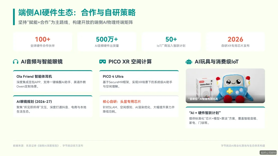 从端侧来看,字节跳动也已启动了端侧 AI 芯片的布局,围绕智能硬件、移动端场景进行专用芯片的研发。根据调研文档披露,字节跳动已为 PICO 头显研发了专用芯片,该芯片已进入量产阶段,能够将 MR 系统延迟压缩至约 12 毫秒;同时,其为 Ola Friend 智能耳机、智能台灯、AI 玩具 “显眼包” 等智能硬件产品,也配套研发了专用的端侧 AI 加速芯片,实现了端侧 AI 能力的本地化运行。