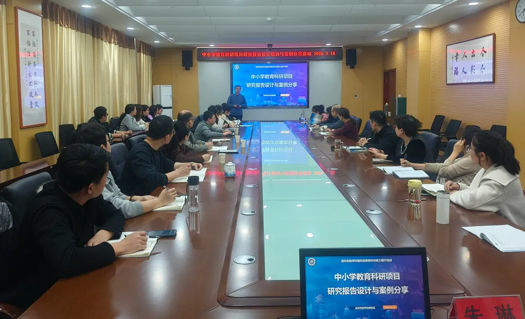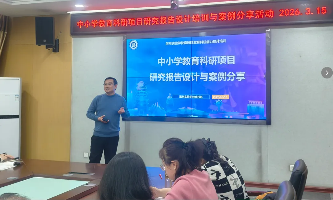 2026年3月15日晚,山东省教育教学研究一般课题结题培训举行。滨州市教育科学研究院教师发展研究中心朱琳应邀作中小学教育科研项目研究报告设计与案例分享专题报告。 滨州实验学校南校区有关负责人、教育科研项目负责人、骨干教师等50人参加活动。专题报告的题目为《中小学教育科研项目研究报告设计与案例分享》,从研究报告设计理论、案例解读、案例分享分析和撰写实战等五个方面,从研究报告摘要、研究问题、研究背景、研究发现与结论、分析与讨论、研究成果等18个模块进行了汇报交流。结合国家级省部级教育科研典型案例进行深度剖析。重点解析了教育科研项目结题报告中的常见误区与改进路径,通过理论讲解+模板示范+互动答疑的实战模式,帮助教师掌握科学规范的教研设计方案,在交流中引导老师们深入思考,真实体会看完 ≠ 学会,你还需要思考与实践。强化教育科研课题全过程管理工作,做好全过程协调、全流程指导、全链条梳理工作,提高教育科研水平,提升教师教育科研能力,助力教育教学高质量发展上提供参考。促进学生核心素养提升